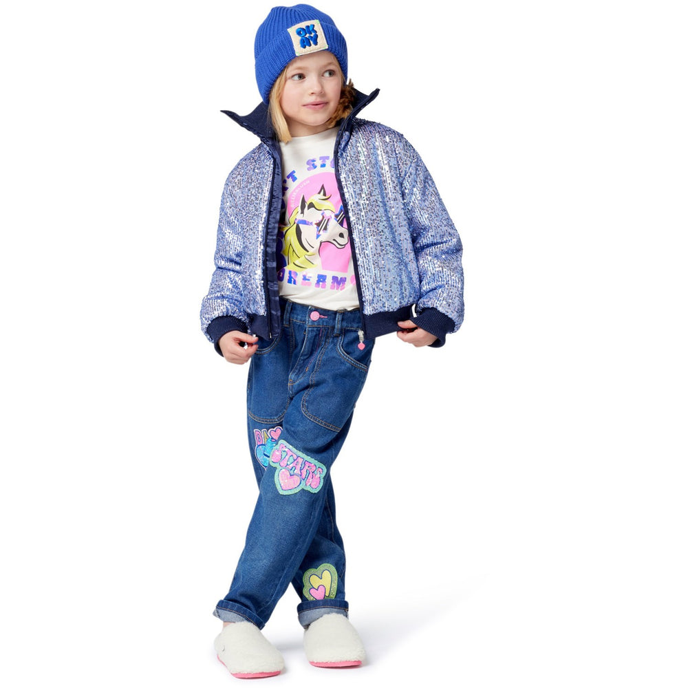 Upptäck våra charmiga Billieblush jeansbyxor, perfekta för din lilla äventyrare! Byxorna är tillverkade i hållbar denim och designade med fyra praktiska fickor, inklusive två stora fram, för alla små skatter som ska bäras med. Highlighten är den lekfulla badgen på benen och en blank silikonetikett på baksidan som ger en unik touch. Med justerbar midja och zip-gylf erbjuder de optimal passform och är enkla att ta på och av. Dessa jeans kombinerar stil med komfort och gör dem till ett utmärkt val för lekfulla dagar.