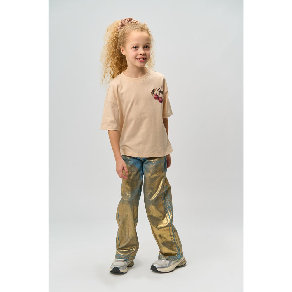 Upptäck vårt senaste tillskott till barnkollektionen – de stiliga och moderna "Light Blue Denim Rosanna Wide Jeans" från THE NEW. Dessa jeans är tillverkade med en lyxig guldbeläggning som ger ett unikt och iögonfallande utseende, perfekt för både lekfulla dagar och speciella tillfällen. Den vida benpassformen inte bara skapar en trendig siluett men även ger optimal rörelsefrihet, vilket är essentiellt för barnens aktiviteter.