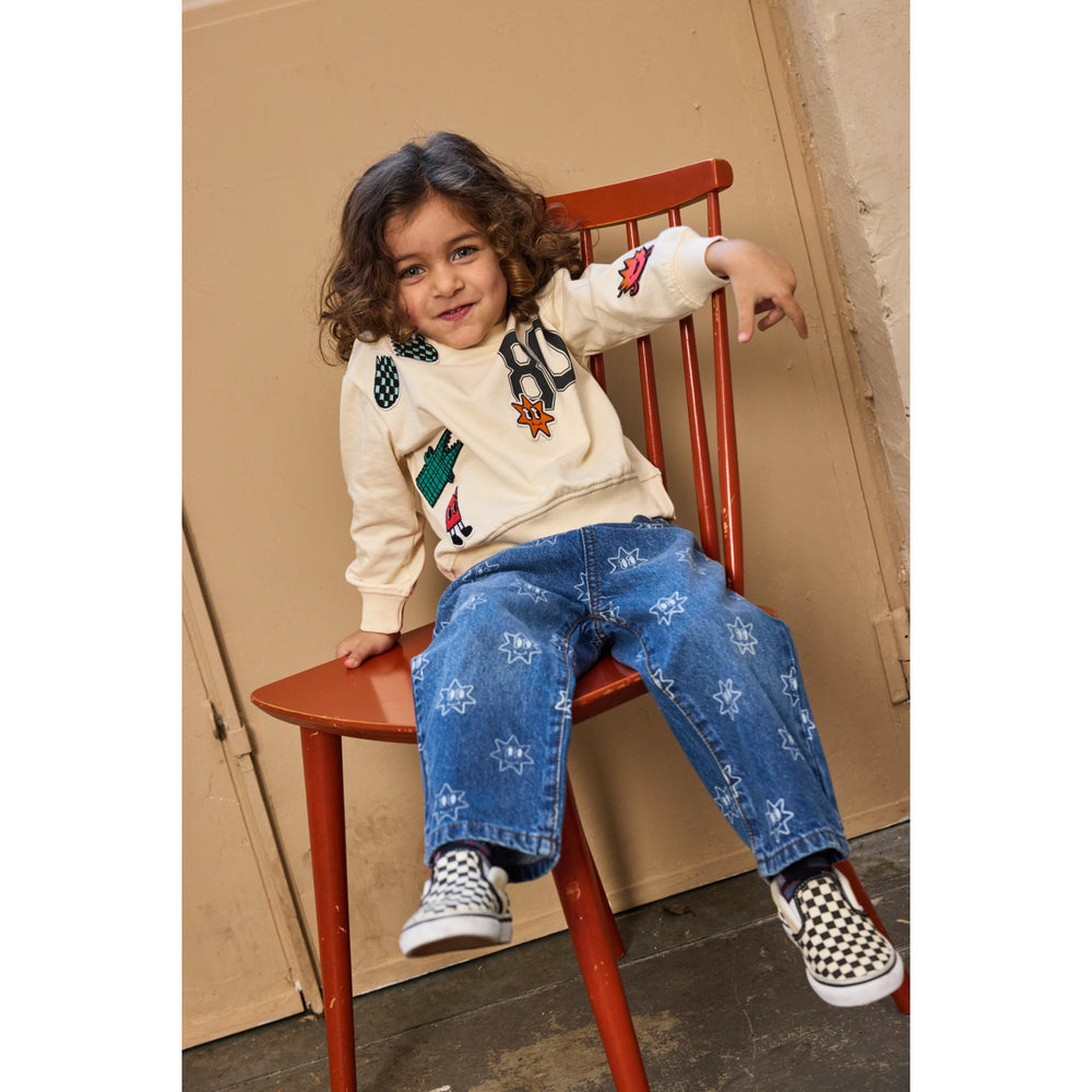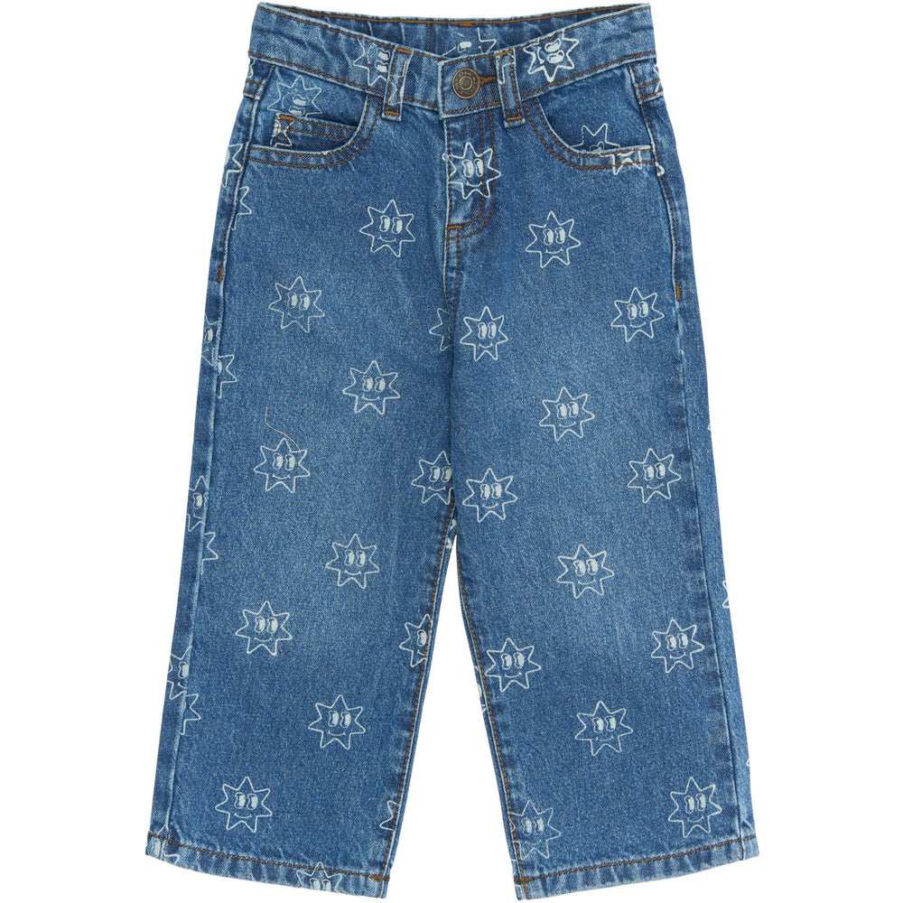Upplev äventyret i garderoben med THE NEW Siblings Medium Blue Denim AOP Ripley Wide Jeans. Dessa trendiga barnjeans har en lekfull och robust design, idealiska för de små som älskar att kombinera stil med komfort. Tillverkade i mjuk men slitstark denim, erbjuder de en avkopplande vid passform och ett roligt heltäckande mönster av stjärnkaraktärer som direkt fångar ögat. Med ett justerbart midjeband och fem praktiska fickor är dessa jeans både funktionella och bekväma för alla dagens äventyr. Den djärva designen gör dem perfekta för att mixa och matcha med andra plagg, som den koordinerade jeansjackan, för en komplett och stilsäker look.