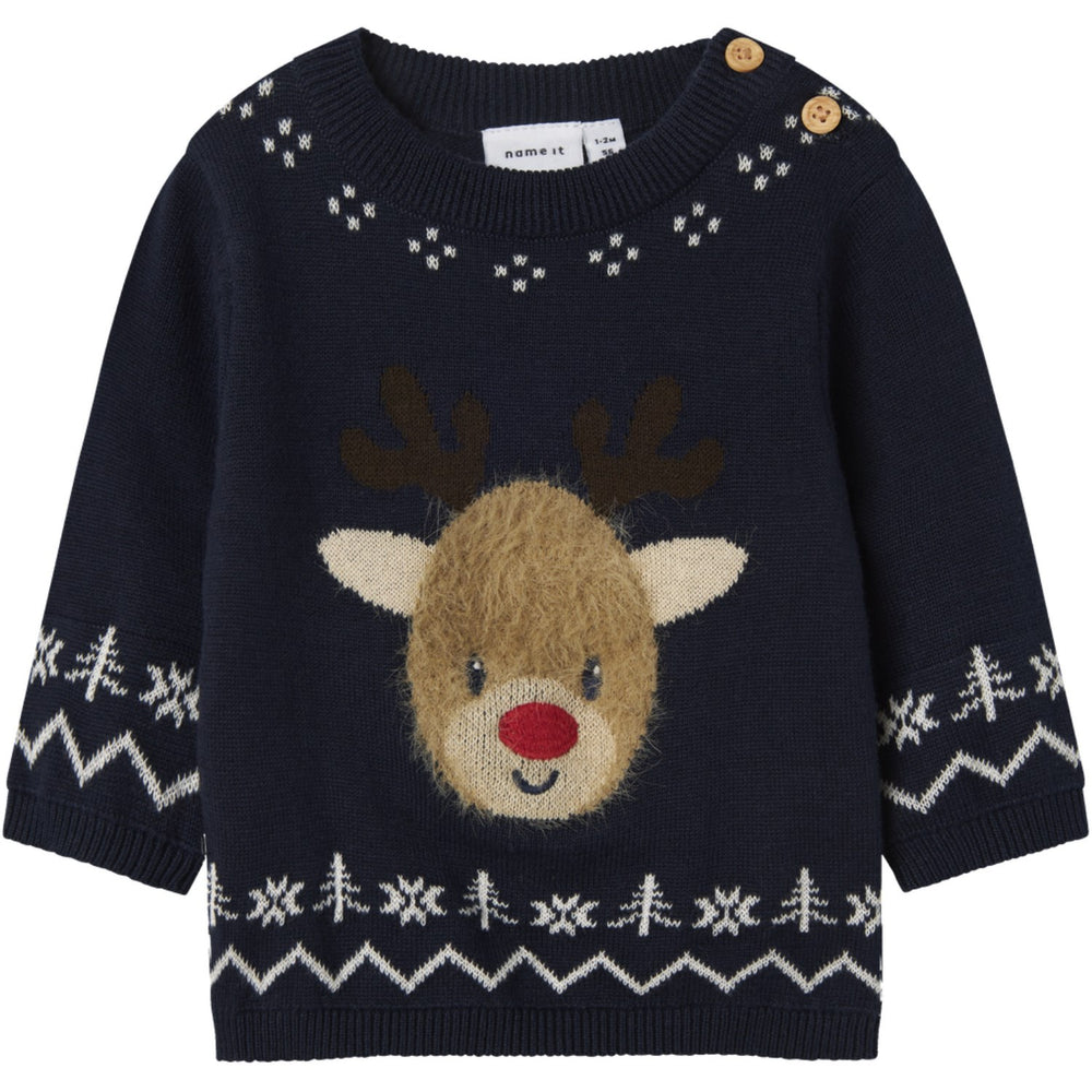Gör barnets garderob redo för festligheterna med vår Name It Navy Blazer Nbmreome Ls Knit! Denna charmiga stickade tröja är perfect för att sprida julglädje. Tröjan är tillverkad i jacquard med ett intrikat stickat mönster som ger både struktur och en tidlös charm. Den klassiska marinblå färgen kombinerat med det lekfulla mönstret gör plagget oemotståndligt.