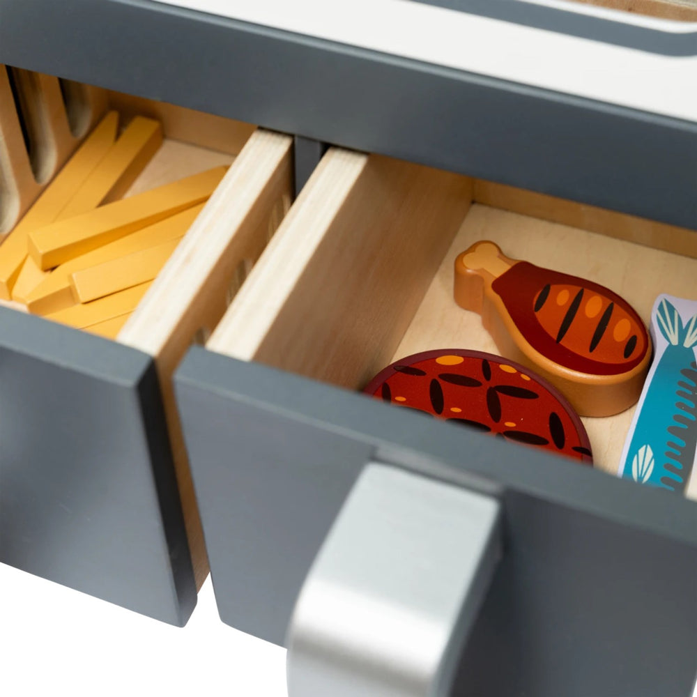 Setet inkluderar träleksaksmat så som pommes frites, en fisk, en biff och ett kycklinglår, vilket inte bara ger barnen en chans att utforska olika maträtter utan också stimulerar deras fantasi och kreativitet. Varje del är tillverkad med tanke på hållbarhet och enkel rengöring, vilket gör leksaken till en idealisk följeslagare i många år.