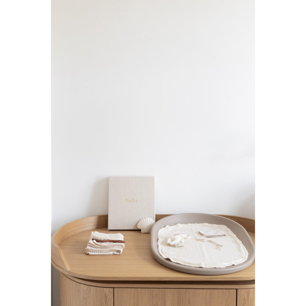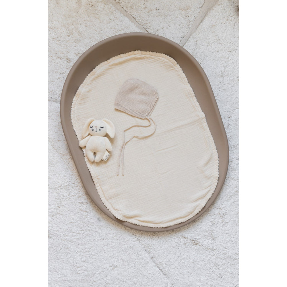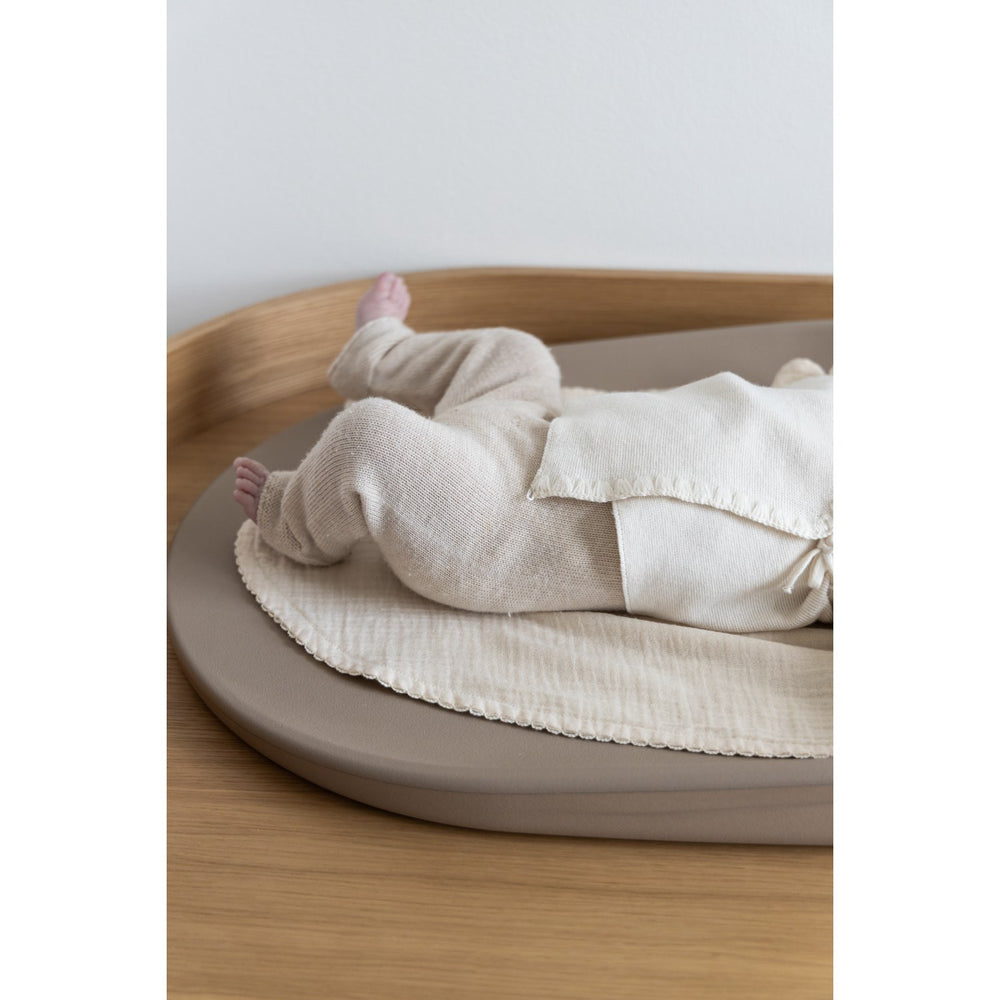 Varje skötmatta i setet är tillverkad av 100% ekologisk muslinbomull, vilket garanterar mjukhet och hög absorptionsförmåga med sina fyra lager. Den cremefärgade mattan kompletterar elegans med funktionalitet samt matchar smidigt med andra produkter i vår KAI-serie.