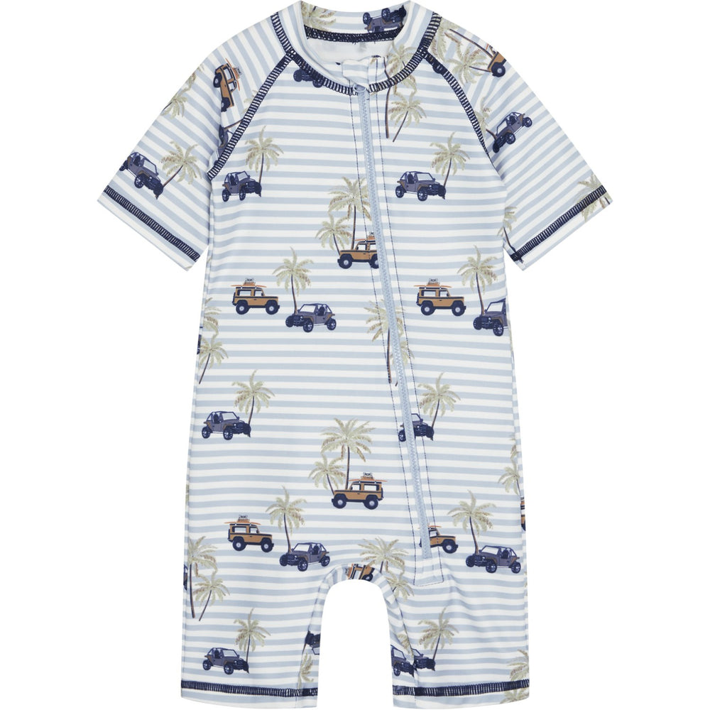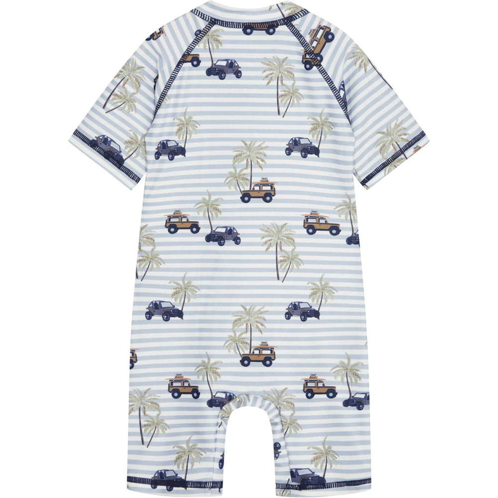 Designen är lekfull och praktisk med korta ärmar och en asymmetrisk skärning från nacke till vänster ben. Välj mellan två iögonfallande mönster: ett livligt safaritryck eller ett roligt dinosaurietryck. Tack vare UV50+/UPF50-filter kan ditt barn leka tryggt i solen, skyddat från solens strålar.
