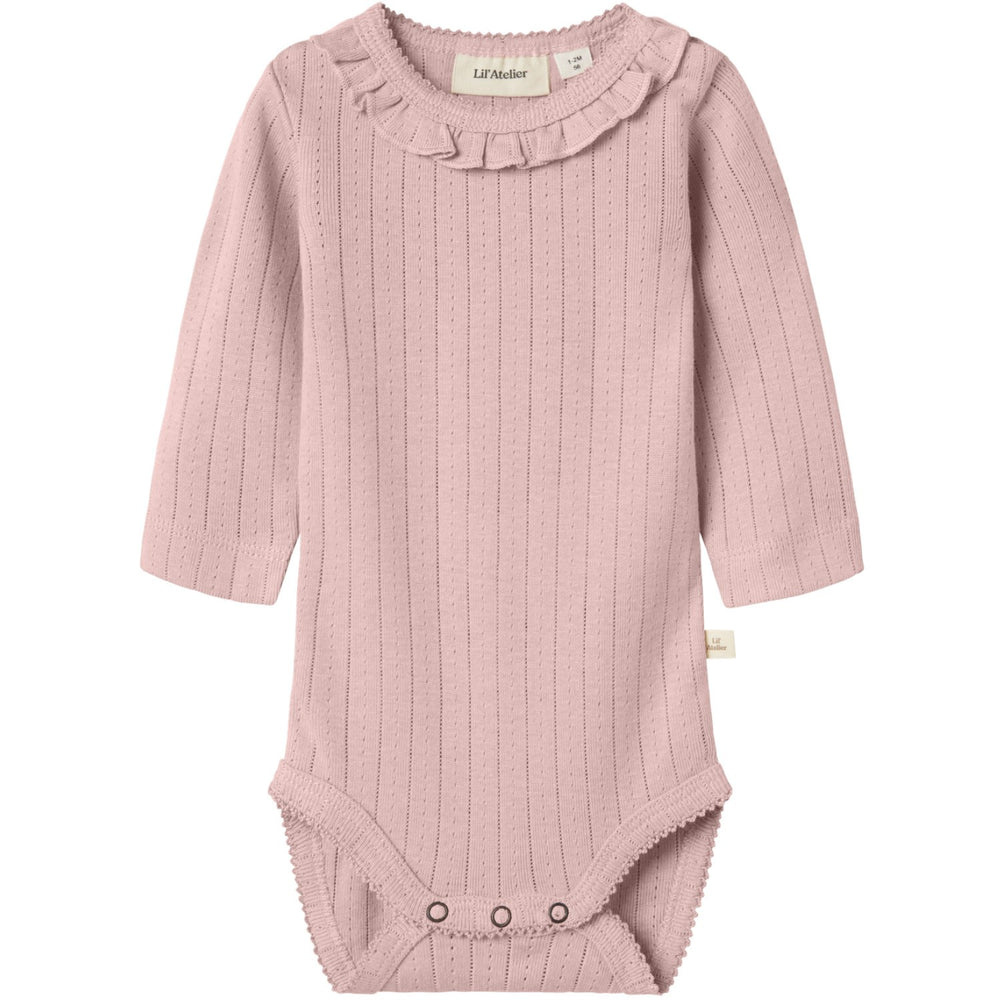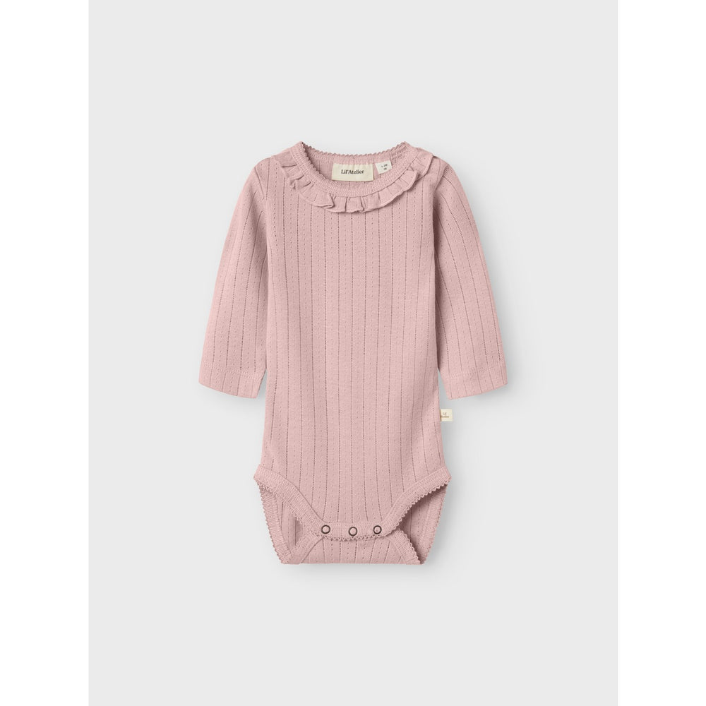 Upptäck Lil'Atelier's Misty Rose Nbfrachel Nis Ls Slim Body Lil Noos för din lilla skatt. Denna bodysuit kombinerar både stil och komfort med sin unika needle drop-teknik som skapar fina mönster och ger plagget en charmig look. Den mjuka rundade halsen och de praktiska långa ärmarna ser till att ditt barn känner sig bekväm hela dagen. Med smarta detaljer som volanger och en diskret etikett samt säkert fäste med pressknappar både i grenen och vid axeln, är detta plagg inte bara snyggt utan också funktionellt.
