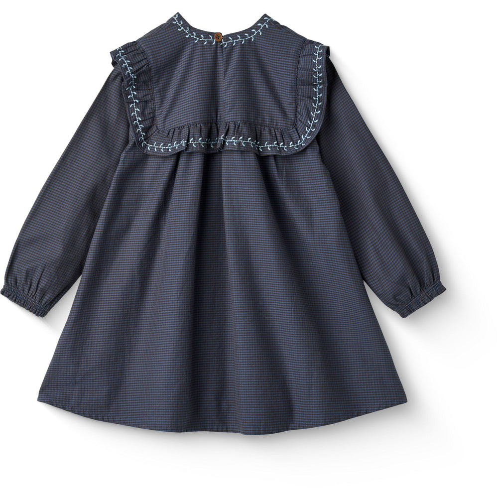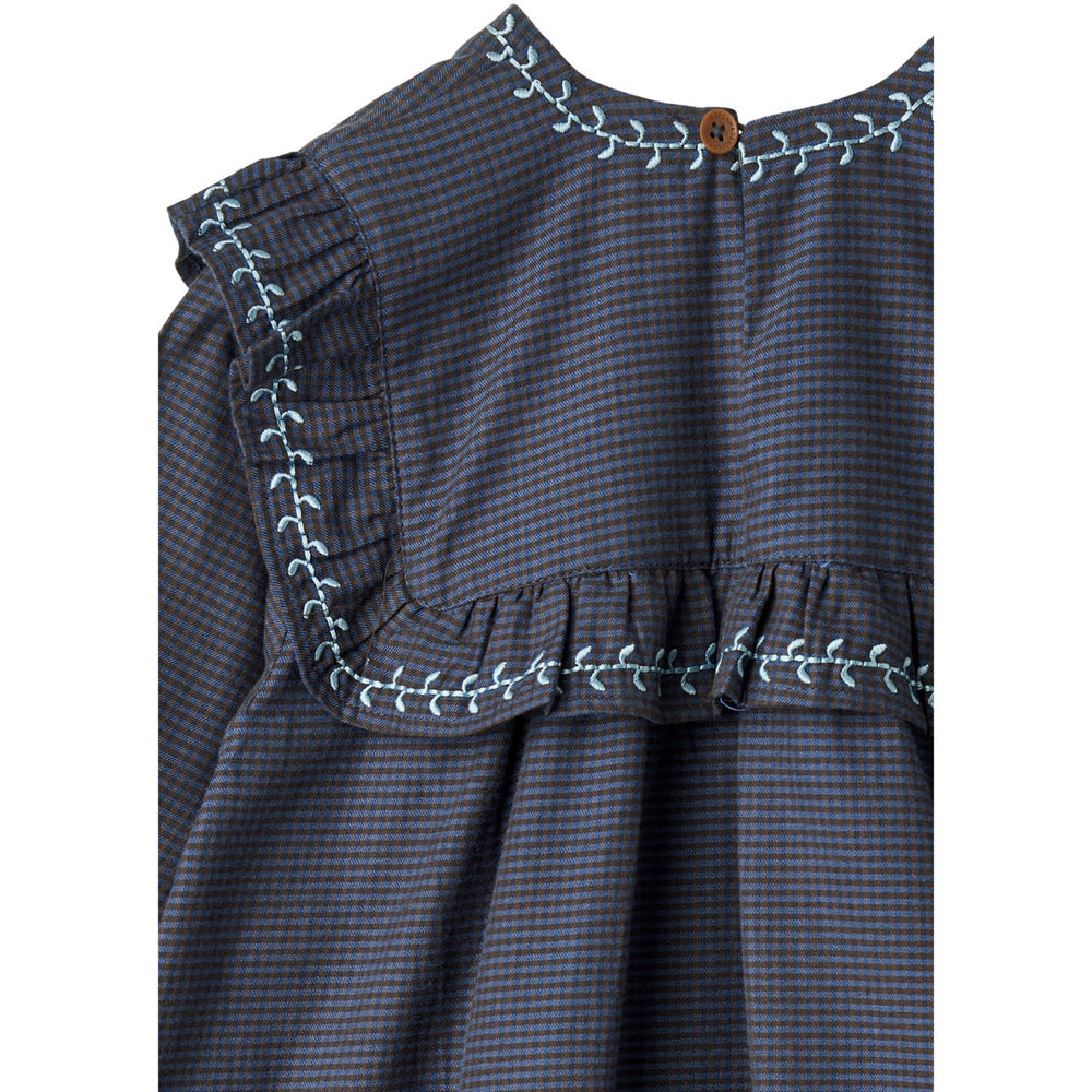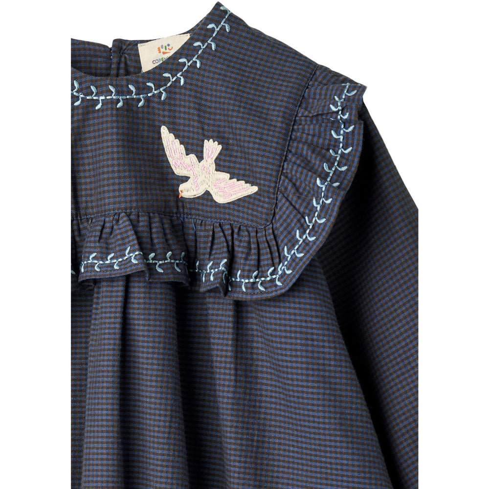 Upptäck den charmiga rutiga klänningen från Copenhagen Colors, en förstklassig kombination av stil och komfort för ditt barn. Tillverkad av ett mjukt, vävt tyg i en iögonfallande brun och blå kombination, pryds denna klänning av ett delikat broderat fågelmotiv och har en snygg handsydd kant. Långa ärmar med elastiska manschetter säkerställer en bekväm passform medan den rynkade kjolen och volangprydda haklappen lägger till en vintage touch. Perfekt för festliga tillfällen eller en stilfull vardag, en klänning som kombinerar tradition med moderna detaljer. Lätt att sköta om och skapad för att hålla, gör den här klänningen till ett praktiskt och stilsäkert val för din lilla.