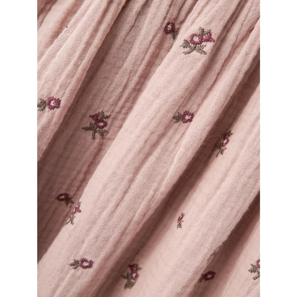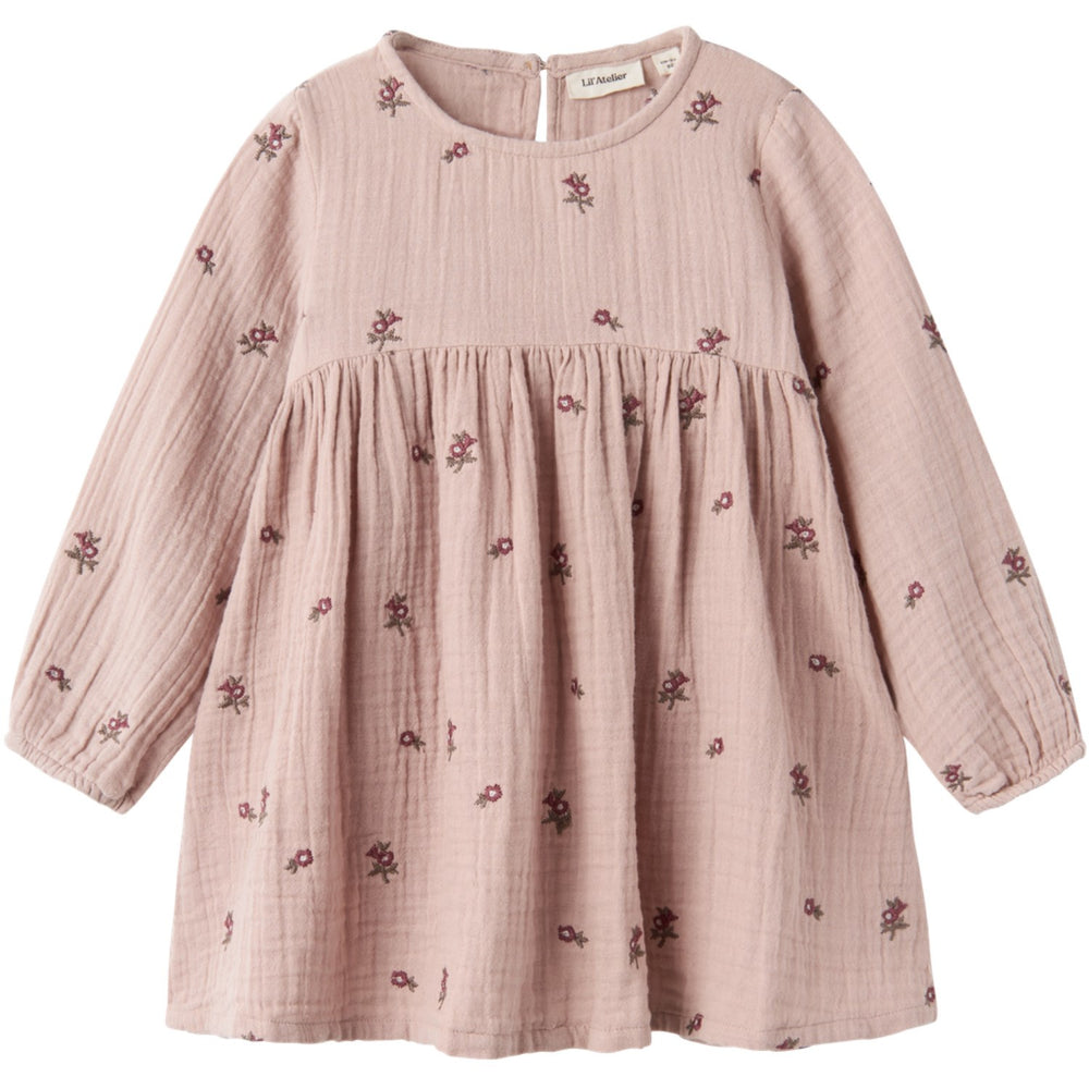 Med dess gråa nyans och subtila mönster, erbjuder klänningen både stil och funktionalitet. Den runda halsen och långa ärmar med elastiska manschetter gör att ditt barn kan röra sig fritt och bekvämt under alla aktiviteter. En enkel knäppning på bak med knapp och ögla gör klädbytet lätt som en lek.