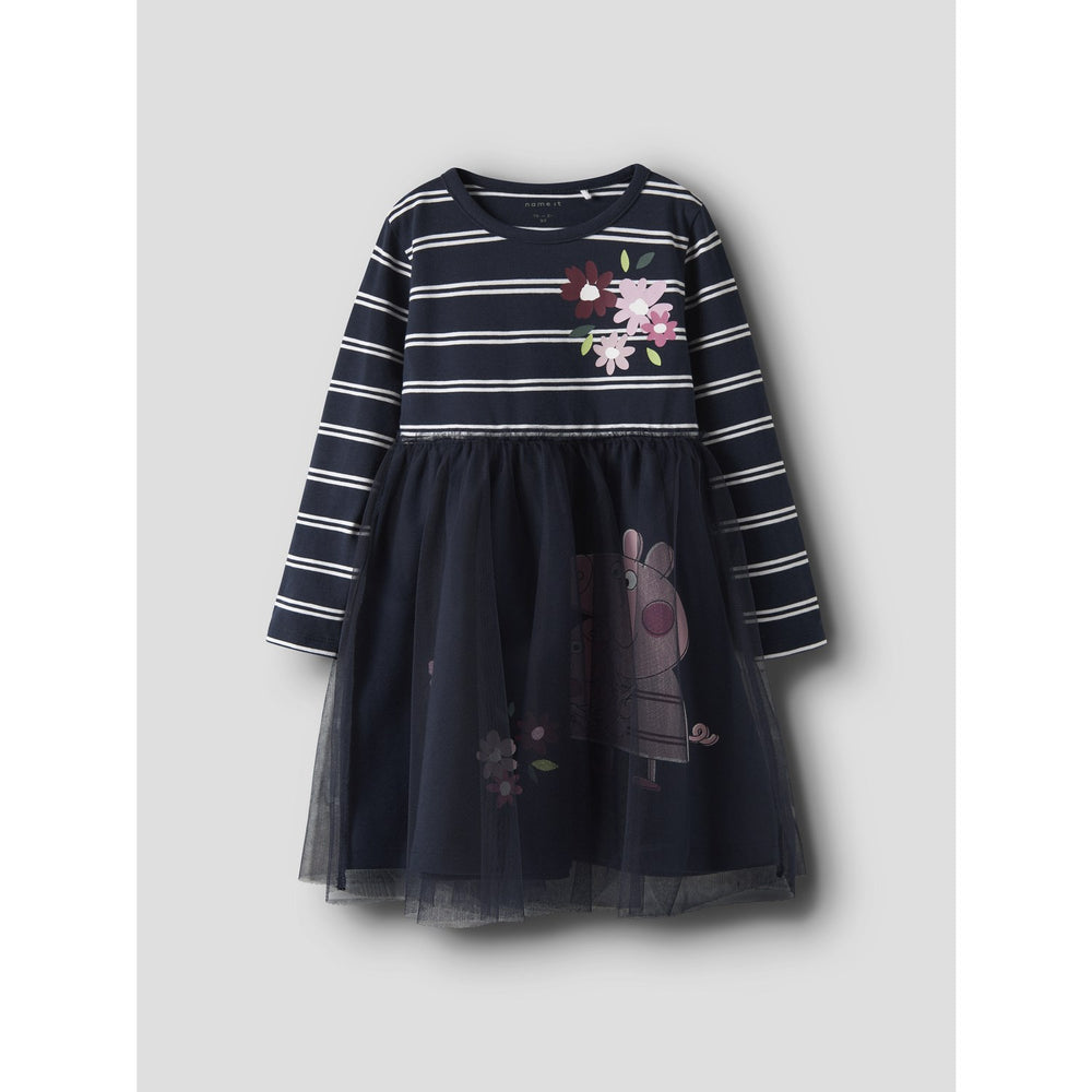 Upplev magin i varje fest eller familjesammankomst med vår Navy Blazer Nmforini Peppa Ls Tulle Dress från Name It. Denna bedårande klänning inspirerad av Greta Gris är designad för att fängsla och förgylla din lilla äventyrare. Klänningen är tillverkad i en behaglig och slitstark kvalitet med långa ärmar och rund hals, vilket bidrar till både stil och komfort. Det lekfulla gummitrycket av Greta Gris, i kombination med den klassiska marinblå färgen och det sirliga tullet, skapar en charmig och barnvänlig look.