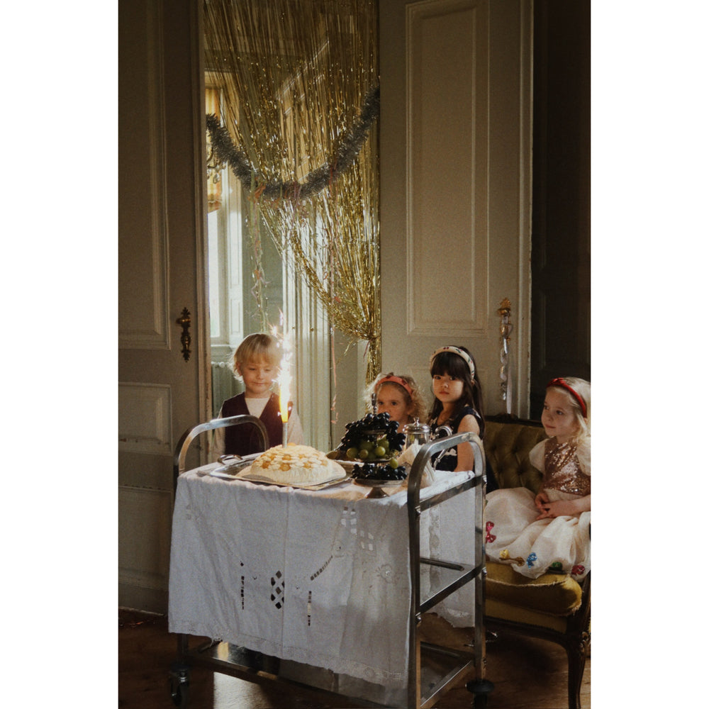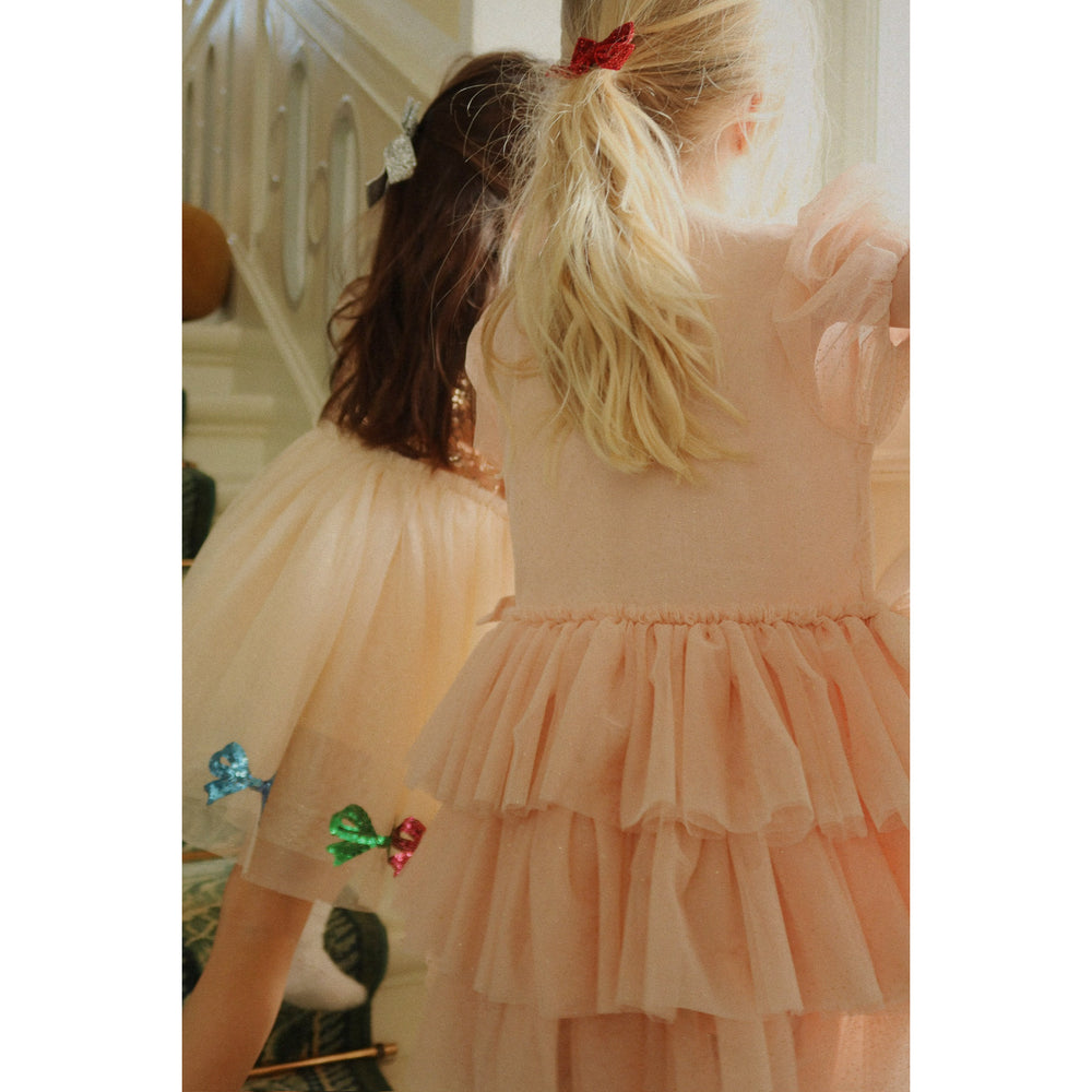 Låt din lilla stjärna stråla i Konges Sløjd Brazillian Sand Mei Klänning, en festlig dröm av en klänning perfekt för speciella tillfällen. Denna charmiga klänning har puffärmar och ett gnistrande paljettliv, toppat med en flerlagers tyllkjol som skapar en äkta prinsesskänsla. Komfortabel att bära tack vare det mjuka bomullsfodret och praktisk med enkel knappstängning i ryggen. Idealisk för festliga evenemang eller bara för att göra vardagen lite mer glamourös. Material: Foder i 100 % polyester och 100 % bomull