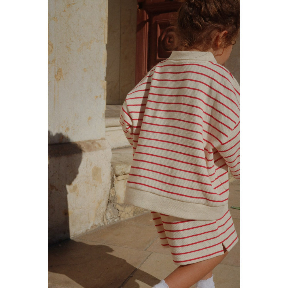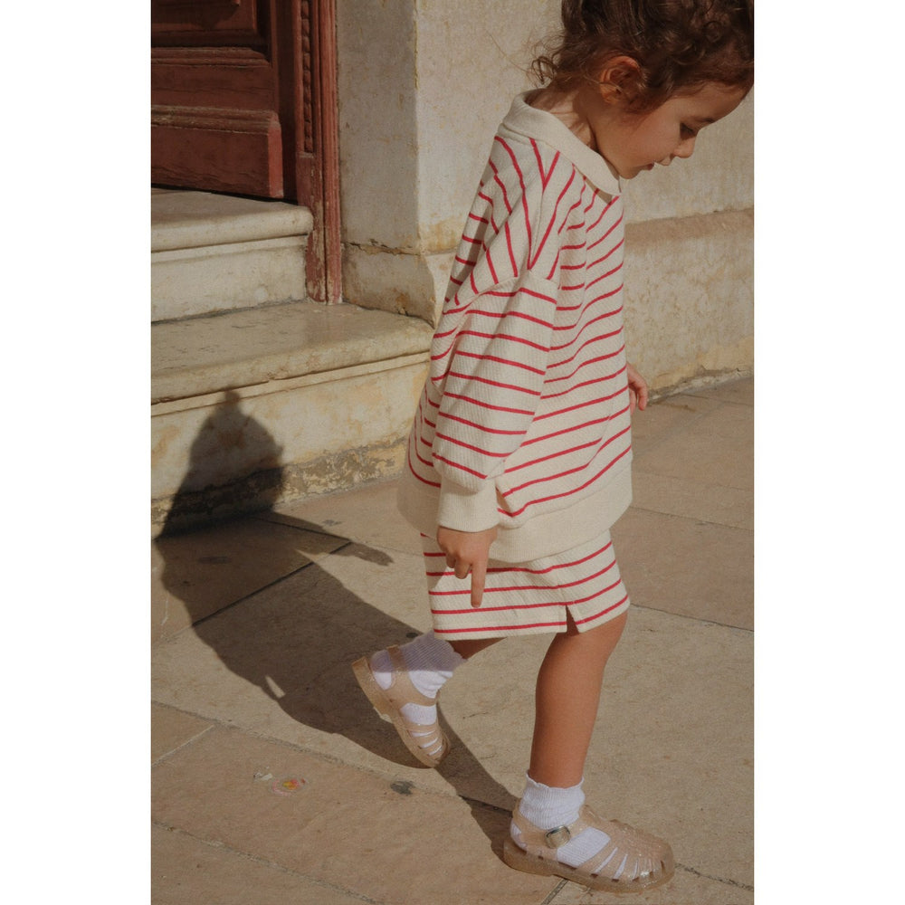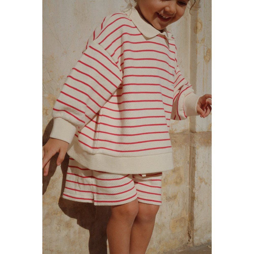 Denna charmiga shorts från Konges Sløjd är perfekt för aktiva barn. Tillverkad i 100% ekologisk bomullstrikå, erbjuder den högkomfort och hållbarhet. Dess mjuka material och avslappnade passform garanterar att ditt barn kan röra sig fritt och bekvämt. Den neutrala färgen och klassiska designen gör shortsen lätta att matcha med andra plagg. Idealisk för lekfulla dagar och även enkla att tvätta och sköta.