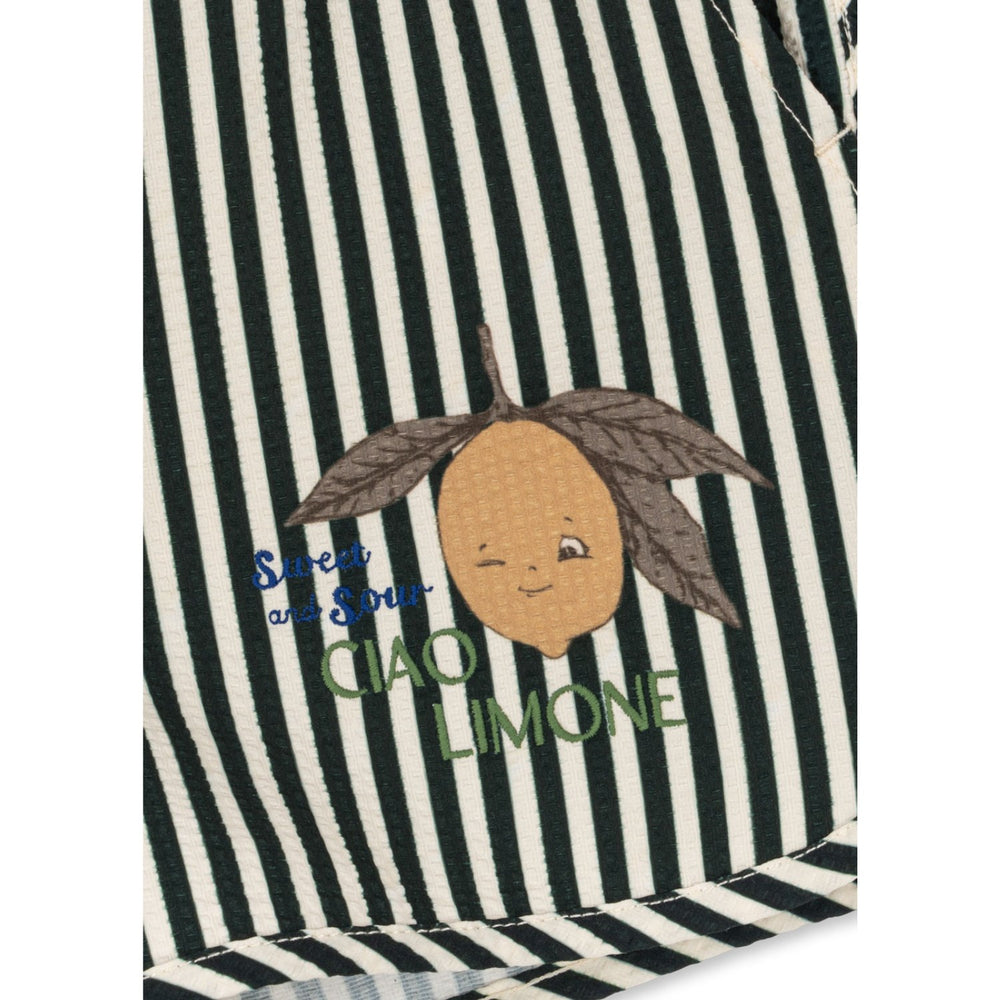 För de små badälskarna finns Konges Sløjd Scarab Seer Asnou Swimshort, perfekt för både pool och strand. Dessa stiliga seersucker badshorts är gjorda av 61% återvunnen polyester och 39% polyester, där minst 50% är GRS-certifierad. Mjuka, hållbara och utformade för att vara bekväma, dessa badshorts kombinerar både mode och miljömedvetenhet. Ge ditt barn det bästa av komfort och stil under soliga dagar!