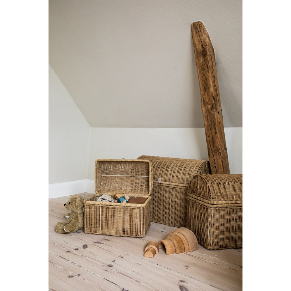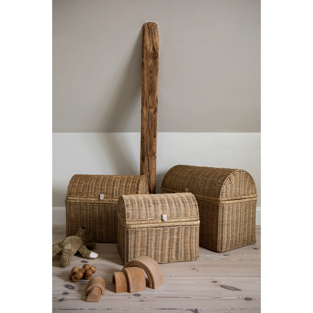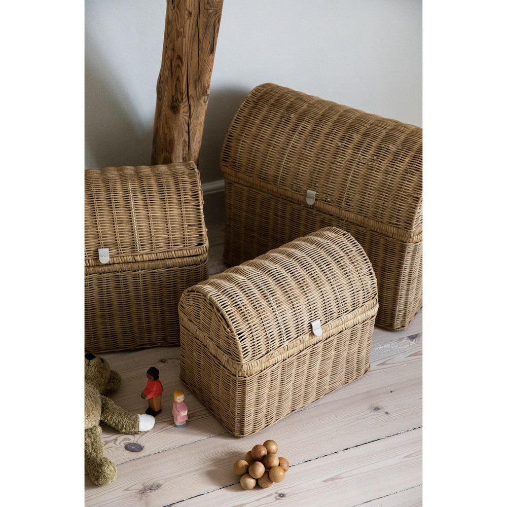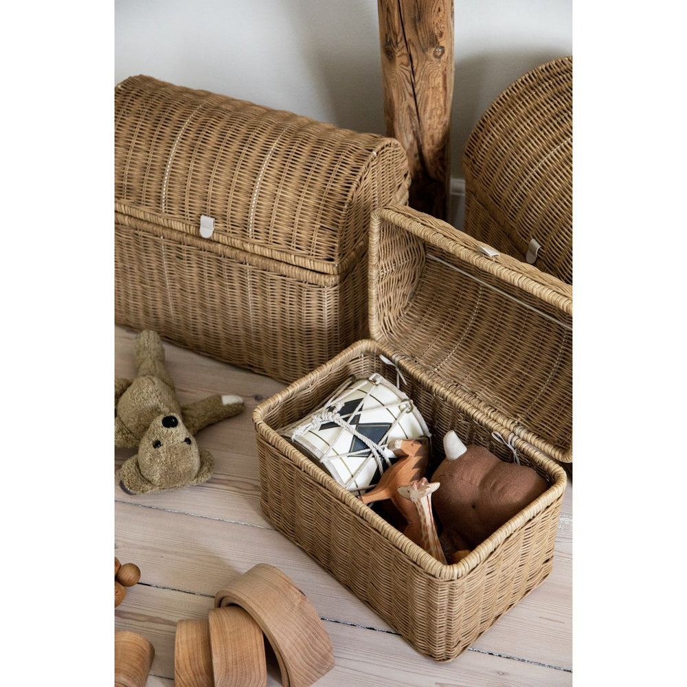 Dekorera och organisera barnrummet med våra handvävda korgar från KAS Kopenhagen. Tillgängliga i tre olika storlekar, erbjuder dessa korgar en säker och funktionell förvaringslösning som elegant kompletterar rummets inredning. Varje korg är unikt handvävd av naturmaterial, vilket ger små charmiga variationer och ger ett personligt uttryck till varje utrymme. Den optimala kombinationen av design och praktisk användning gör dessa korgar till en idealisk plats för att förvara leksaker, böcker eller kläder, samtidigt som de bidrar till en lugn och stimulerande miljö för ditt barn. Material: Raffia & Läderhandtag