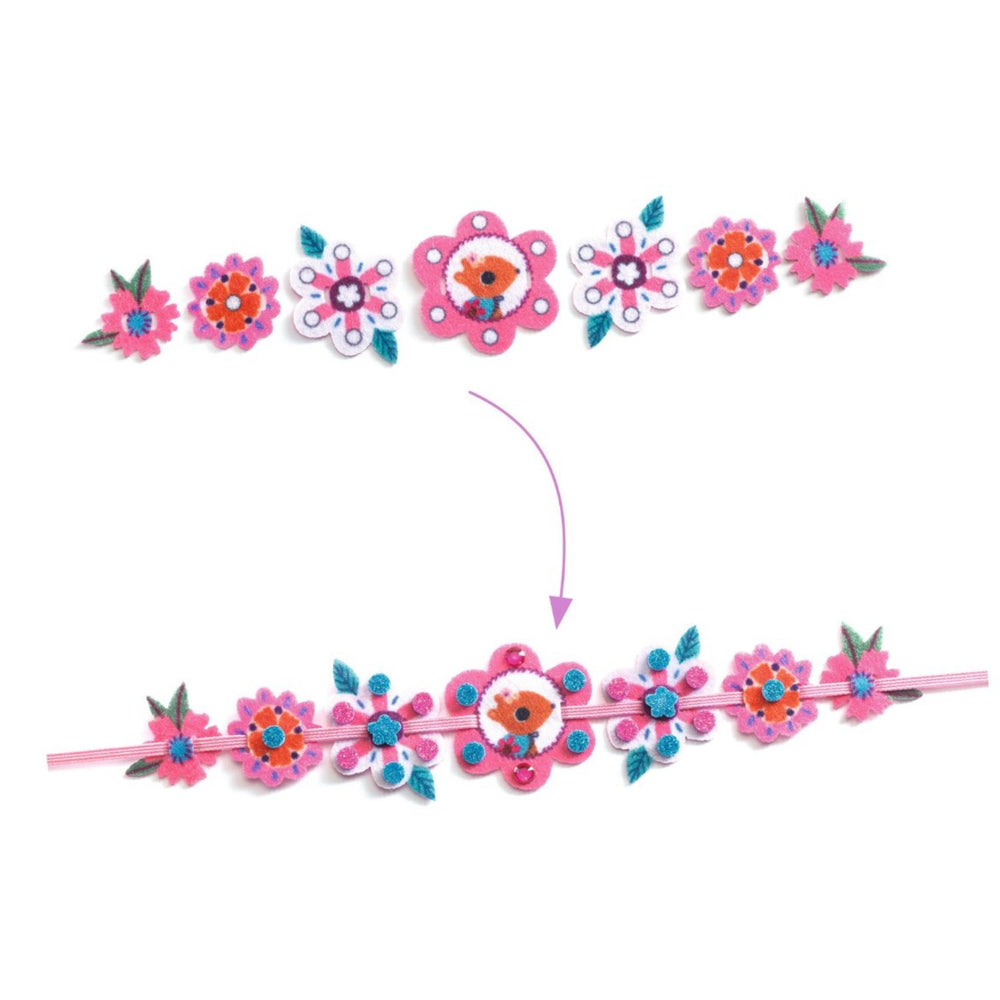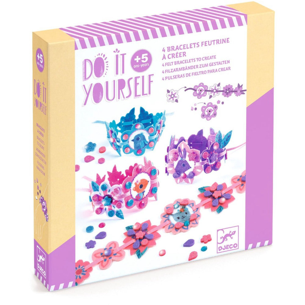 - Inkluderar: 28 förperforerade filtbitar (7 för varje armband), 4 elastiska tygband, 4 ark glittrande skumklistermärken, 1 ark "ädelstens"-klistermärken, 4 stift med rundade ändar, 1 allmän steg-för-steg-guide och 4 mallar för varje armband