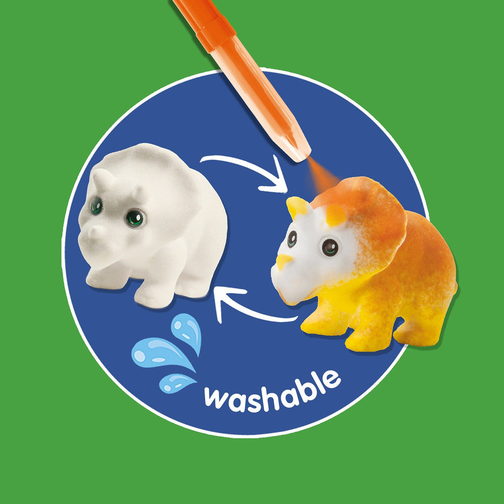 - Innehåll: 3 x dinosaurier, 4 x puffande markörer (turkos, gul, orange, lila), 1 x svamp