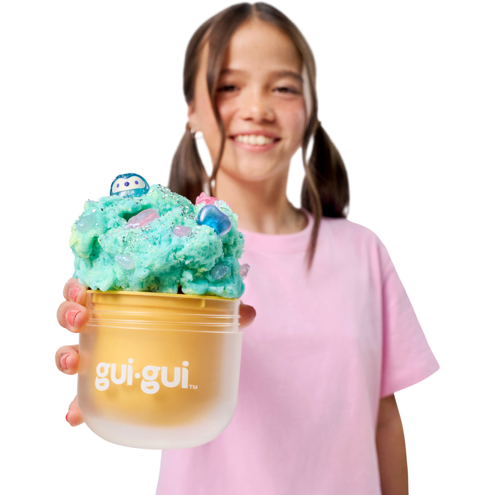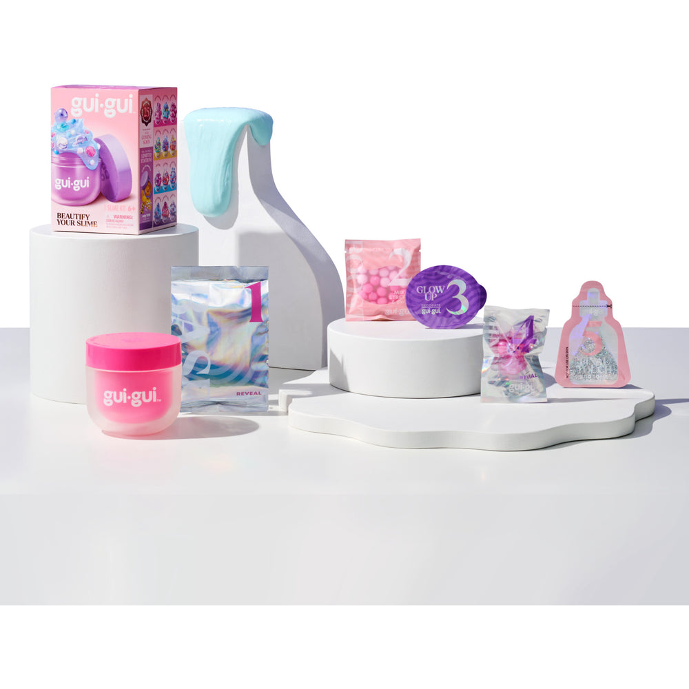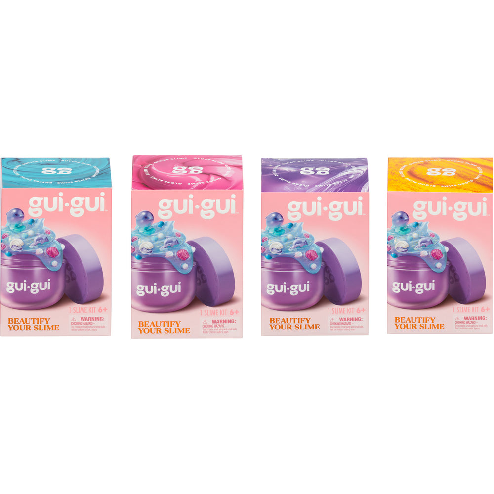 - Extra: Skönhet möter slem. Upplev det senaste inom sensorisk lek med GUI GUI Slime! Inspirerad av skönhetens värld – dess färger, dofter och texturer – erbjuder denna serie en unik unboxing-upplevelse. Välj mellan fyra härliga texturer: Gloss, Clear, Butter och Cloud – var och en med överraskande färger, dofter och charms. Varje paket innehåller också en söt samlarfigur och glitter för att fullborda din skapelse. Perfekt för barn på 6+ år som älskar kreativ lek och överraskningar.
