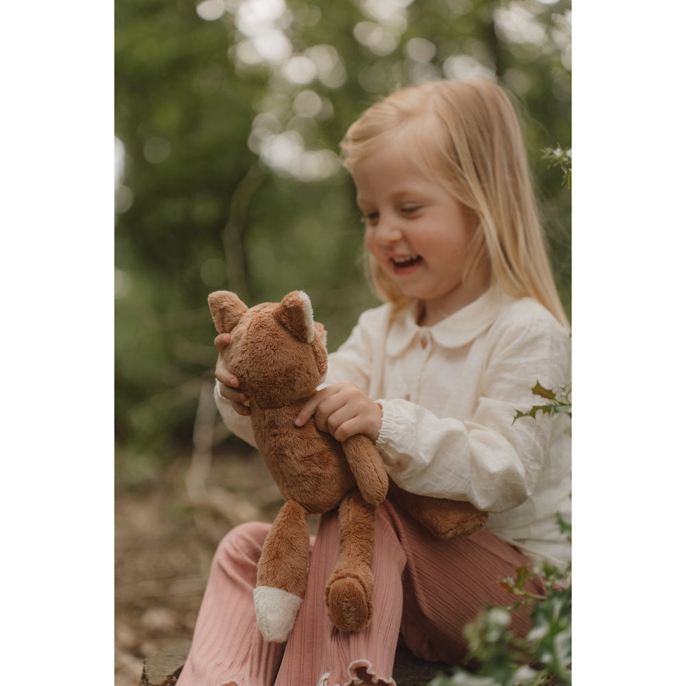 Räven är inte bara en kramvän, utan också utmärkt för att stimulera barnets utveckling genom lek. Dess långa, lättgreppade ben framhäver motoriska färdigheter och underlättar både aktiv lek och samvaro. Dessutom är storleken och designen perfekt anpassad till små barnhänder, vilket gör den enkel att bära med sig under dagens äventyr.