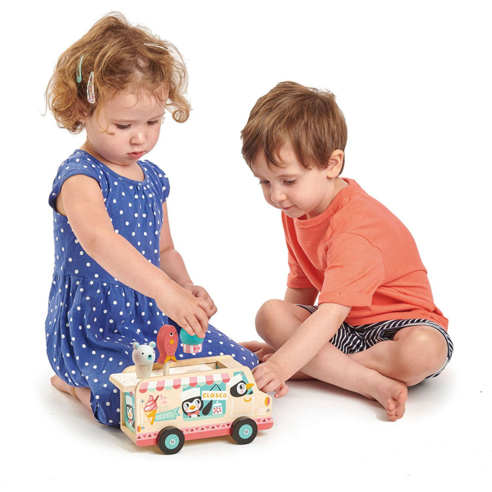 Säkerheten är i högsta hugg då bilen och dess tillbehör är tillverkade i robust trämaterial anpassat för barn. Leksaken främjar barnets utveckling genom dess pedagogiska värde, där de får utforska olika former och färger genom de tre unika glassarna; en fiskformad ispinne, en isbjörnssnökotte och en galen, blå glass, alla designade för att stimulera barnets fantasi och finmotorik.