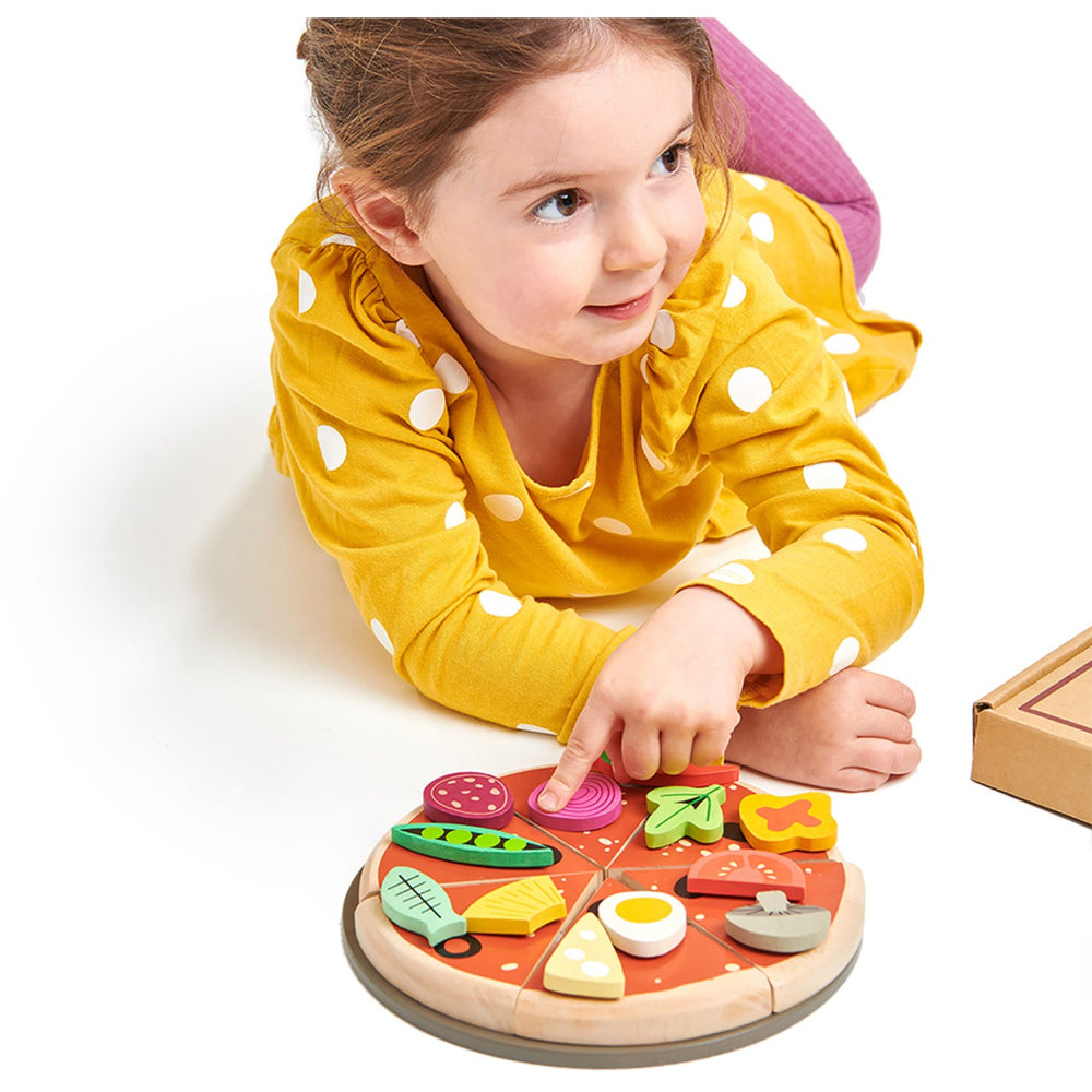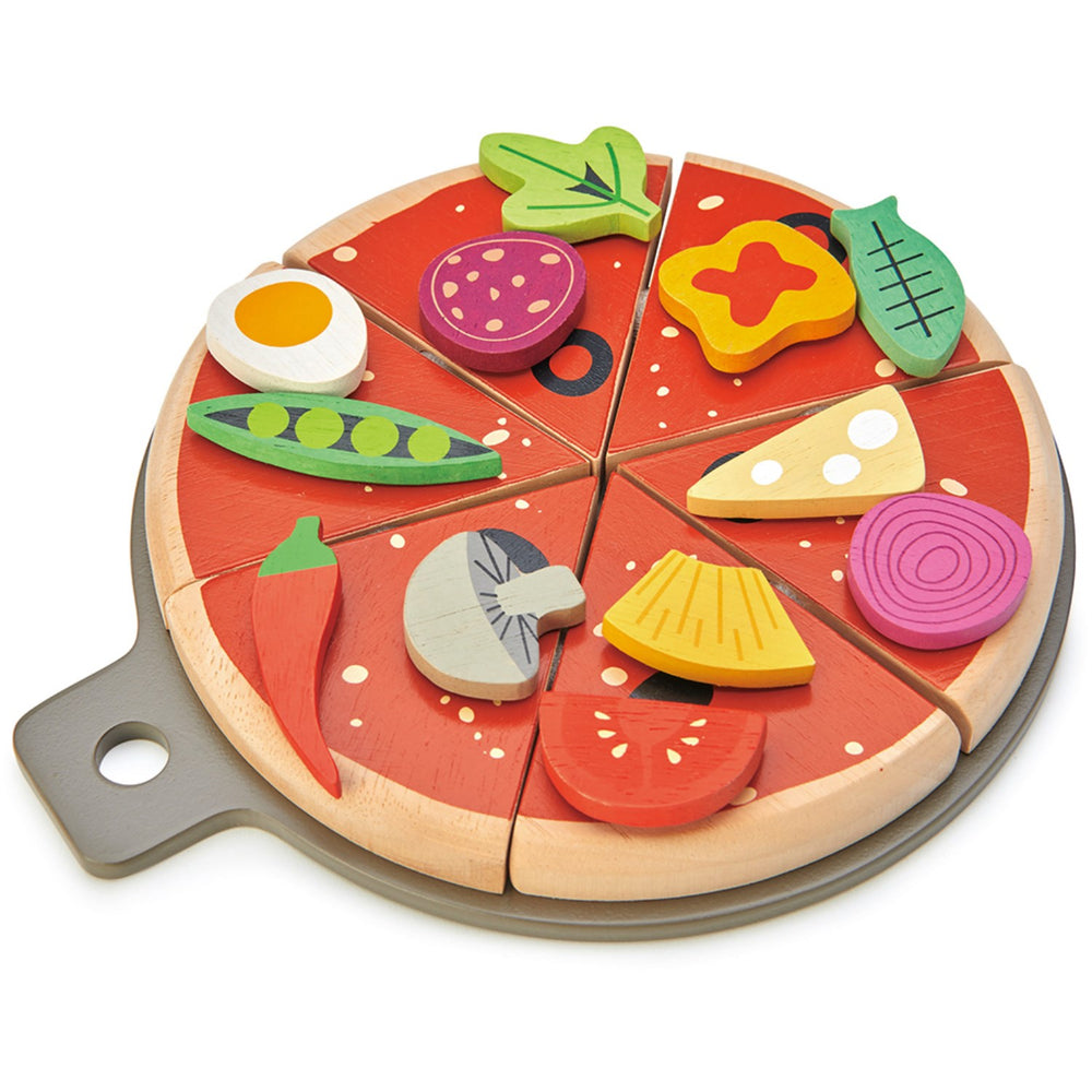 För alla små kockar där ute är Tender Leaf Pizza Fest ett fantastiskt tillskott till lekstunden. Denna träleksak låter barnet designa och servera sin alldeles egen pizza. Tillverkad av robust trä garanterar den både säkerhet och hållbarhet. För de små pizzabagarna skapar pizzan, som kan delas i sex bitar med kardborreband, en engagerande och interaktiv erfarenhet. Barnen kan öva på att räkna och utforska olika kombinationer av de 12 vidhängande pizzatoppingarna.
