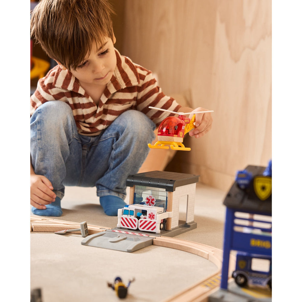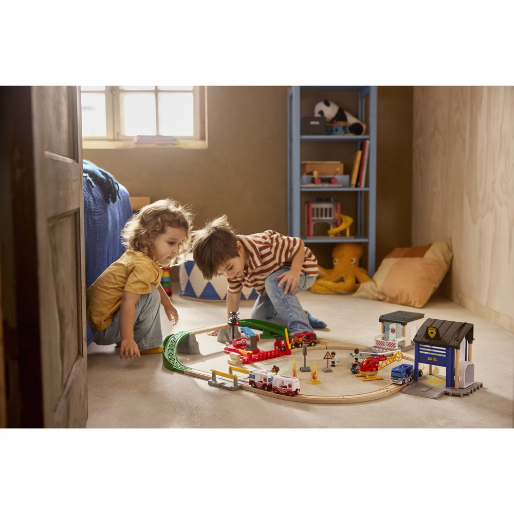 Setet innehåller en rad säkra och anpassade delar för barn från 3 år. Med både tåg och andra fordon, så som polismotorcykel och ambulans, samt ytterligare karaktärer och byggnader för räddningsteman, stöttar detta set barnets utveckling av finmotorik på ett lekfullt sätt. Varje element av designen har utformats med barns säkerhet som prioritet, där leksakerna är tillverkade av högkvalitativ plast och Europeiskt FSC-certifierat trä.