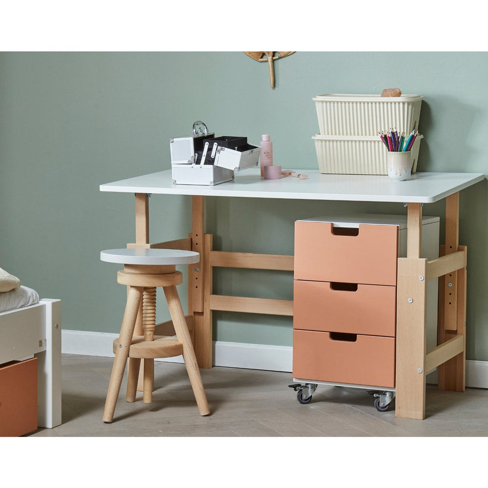 Upptäck Manis-h Snow White justerbart skrivbord med stel i bøgetræ, en stilren och mångsidig möbel för alla barns rum. Den här speciellt designade möbeln kombinerar säkerhet och funktionalitet med en attraktiv estetik. Bordets höjd och lutning är justerbar, vilket möjliggör en ergonomisk anpassning till barnets växande behov. Tillverkat med en robust MDF-skiva och en stabil bokram, erbjuder detta skrivbord både hållbarhet och en tidlös look. Den smarta designen tillåter placering under en hög säng, utnyttjande av utrymme för en effektiv och trivsam arbetsmiljö. Idealiskt för allt från lek till läxläsning, detta skrivbord främjar också barnets kreativa och pedagogiska utveckling. Kombinera med tillhörande byråer eller hyllor för en komplett och funktionell inredning.