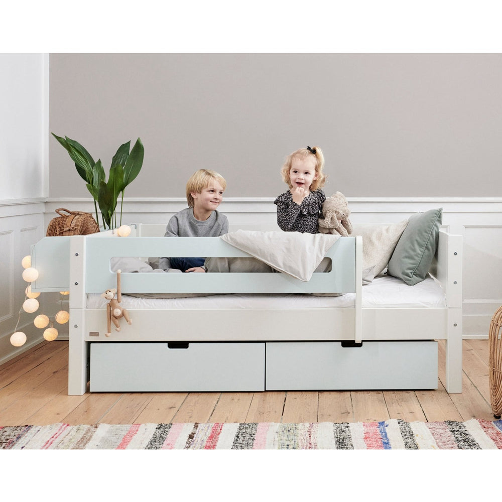 Sängen är utrustad med en robust ribbotten och en stark sängram som garanterar stabilitet och säkerhet. Den frammonterade sänglisten bidrar ytterligare till säkerheten, förhindrar fall under natten. Under sängen finns rymliga lådor som erbjuder smart förvaring för leksaker och sängkläder, vilket hjälper till att hålla barnrummet organiserat och prydligt.