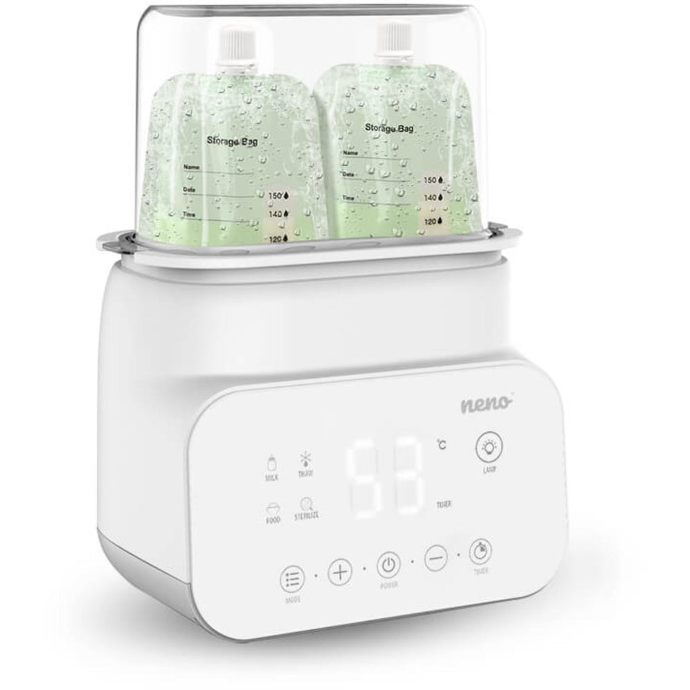 Neno Hvid Sterilisator och Flaskvärmare Vita är en oumbärlig hjälpreda för alla småbarnsföräldrar som vill hålla barnets mat och dryck säkert tillagad och steril. Denna mångsidiga maskin är utrustad med funktioner för att sterilisera nappflaskor, värma mjölk, tina och värma mat, allt för att underlätta din vardag. Med Neno Vita slipper du oroa dig för bakterier då steriliseringsfunktionen effektivt håller flaskor och spenar rena. Dessutom kan den snabbt värma upp mjölk till en perfekt temperatur med enkel inställning. Den praktiska avfrostningsfunktionen möjliggör upptining av måltider och drycker på ett säkert och hygieniskt vis. Inte nog med det, Neno Vita kan också lysa upp natten med sin inbyggda nattbelysning, vilket gör det enkelt att förbereda måltider även under småtimmarna utan att störa barnets sömn. Måtten 20,2 x 14,5 x 17 cm och vikten på endast 1 kg gör den både lättplacerad och enkel att hantera. Lägg till detta en användarvänlig display så har du en modern och effektiv lösning för ditt barns måltider. Neno Vita är en trygg och bekväm investering för ditt barns bästa.