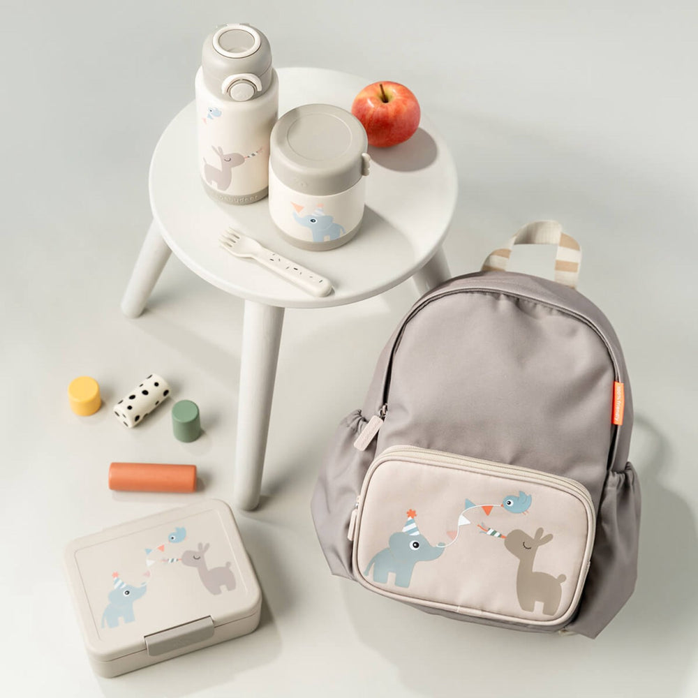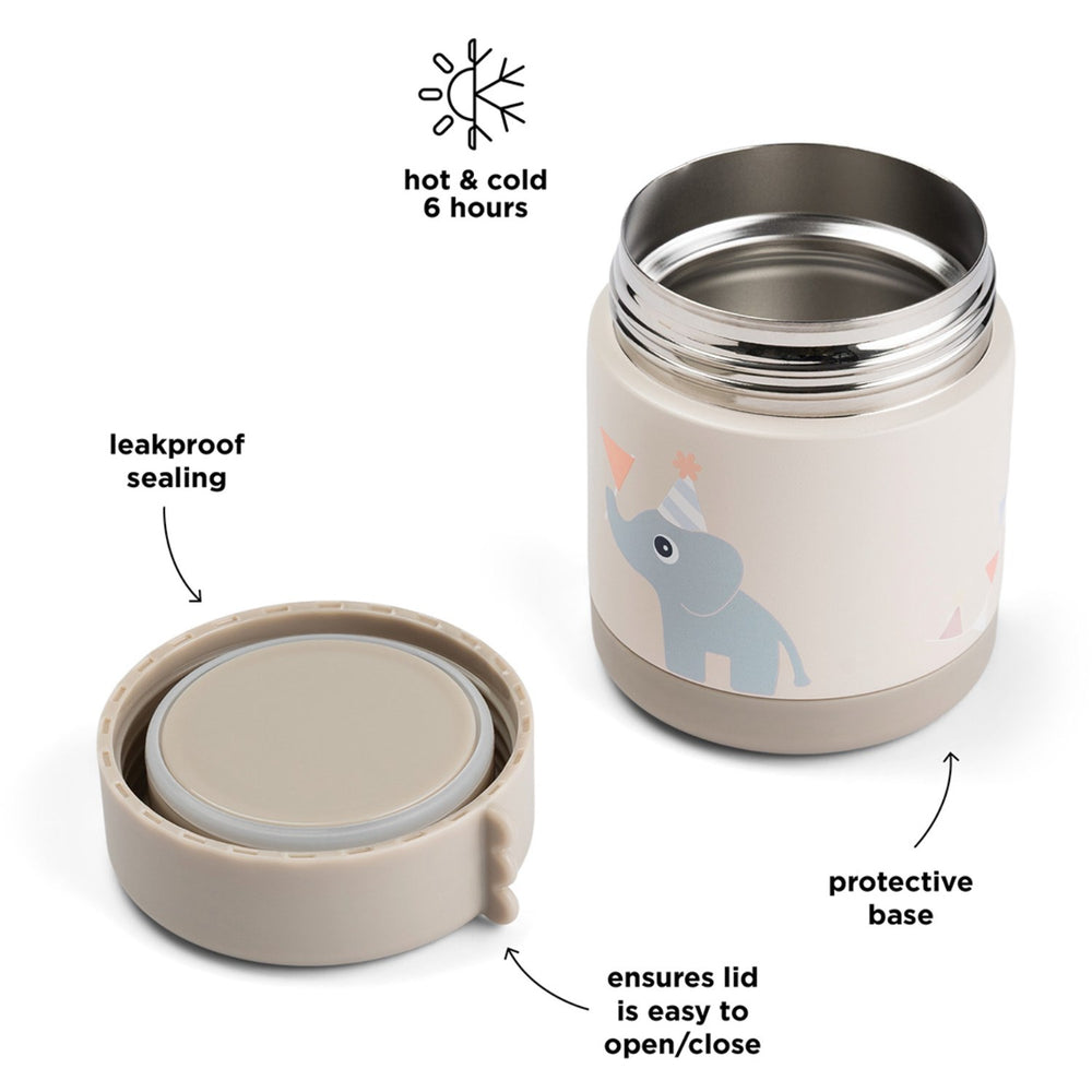 Upptäck DonebyDeer Sand Termisk Matburk Celebration 300 ml, den perfekta lunchlösningen för ditt barn. Denna matburk är designad för att vara enkel för små barnhänder att öppna och stänga. Med en smart silikontätning hålls innehållet både lufttätt och droppsäkert, vilket gör den idealisk för dagis, skolan eller utomhusaktiviteter. Matburken bibehåller temperaturen på maten - varm eller sval - i upp till sex timmar tack vare en gradvis temperaturförändring, vilket garanterar en fräsch måltid när det är dags att äta. Den rymmeliga behållaren på 300 ml är avslutad i en behaglig sandfärg och pryds av ett charmerande motiv med Birdee, Elphee & Lalee, vilket säkerställer att måltiderna blir både roliga och funktionella.