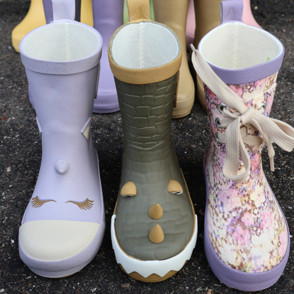 Upplev glädjen i vattenpölar med Mikk-Line Dusk Lace Printed Gummistövlar! Dessa charmiga barnstövlar, utformade med lekfulla mönster och dekorativa snören, förenar stil med praktisk funktionalitet. Tillverkade av miljövänligt naturgummi garanterar de fullständig vattentäthet och är samtidigt helt fria från skadliga ftalater. Reflexdetaljer ökar synligheten i dåliga ljusförhållanden och de robusta, halkfria sulorna med räfflor ger ett säkert grepp på hala underlag.