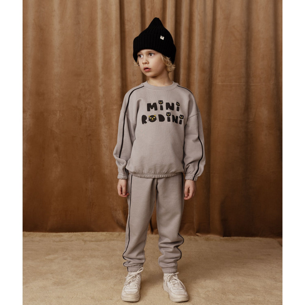 Uppdatera din lilla äventyrares garderob med Mini Rodini grå sweatpants med snygga vita rörkanter. Dessa mjuka byxor är tillverkade av hållbart material som garanterat håller för lek och rörelse. Den avslappnade passformen och det elastiska midjebandet erbjuder optimal komfort och rörelsefrihet. Enkel att sköta och perfekt för allt från skola till lekparken. Klä ditt barn i både stil och komfort med dessa mångsidiga och slitstarka sweatpants.