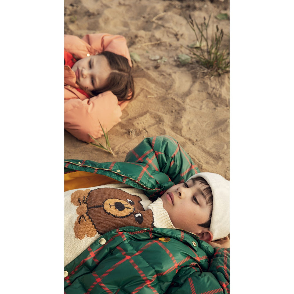 Upptäck Mini Rodini's charmiga off-white Björn Intarsia stickade tröja, perfekt för kyliga dagar. Tillverkad i mjukt, skonsamt material som är behagligt mot barnets hud. Designen kännetecknas av ett lekfullt björnmönster som ger en unik stil. Tröjan erbjuder en bra passform som är idealisk för barn i rörelse, och dess lättskötta egenskaper gör den till en favorit i varje barns garderob.