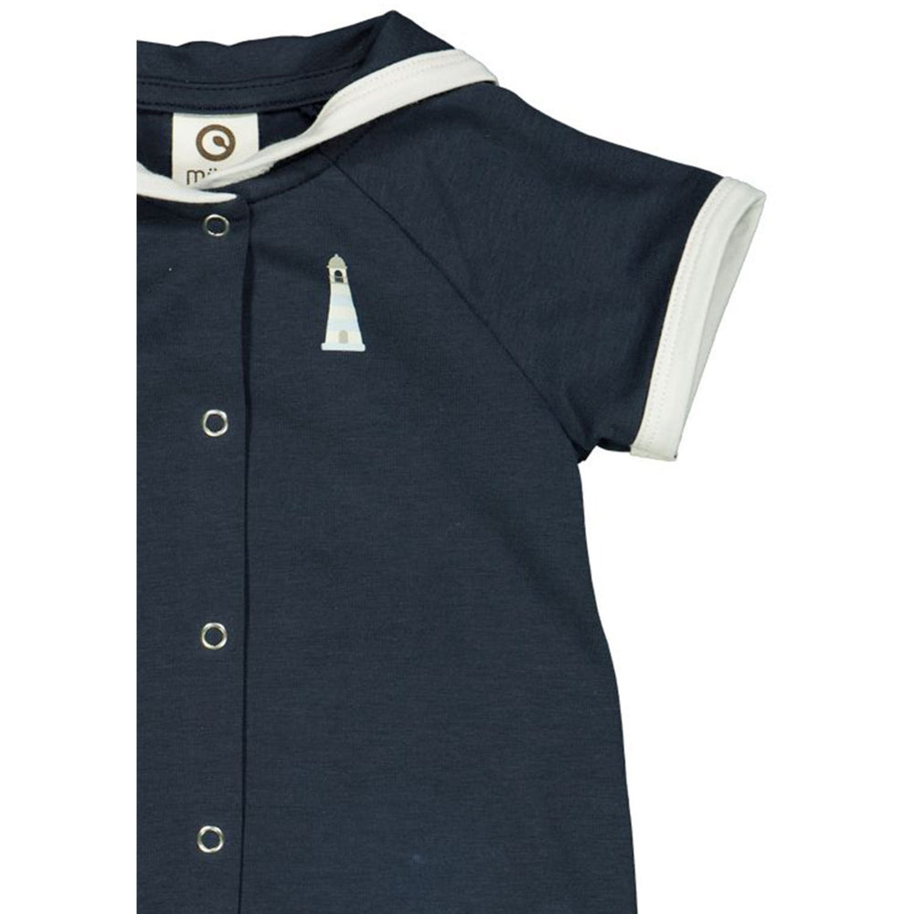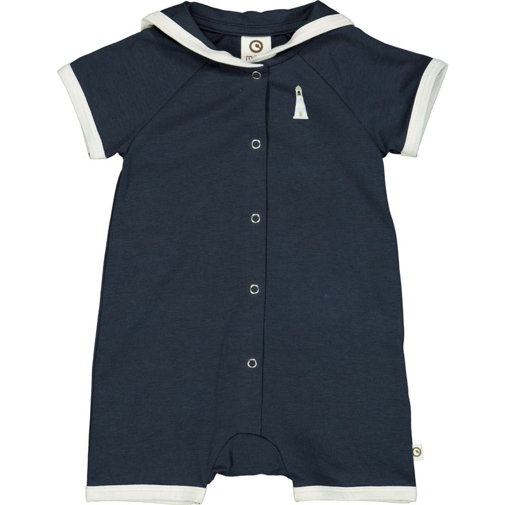 Upptäck den charmiga Müsli Night Blue Breeze Print Beach Jumpsuit för en perfekt sommardag! Denna strandjumpsuit har ett nautiskt tema i marinblått och vitt, och är lika stilfull som funktionell. Med en unik design som påminner om en sjömansdräkt, inkluderar den en dekorativ krage både fram och bak. Jumpsuiten är tillverkad av GOTS-certifierad ekologisk bomull (95%) och elastan (5%), vilket inte bara garanterar miljövänlighet men även skön stretch för maximal rörelsefrihet.