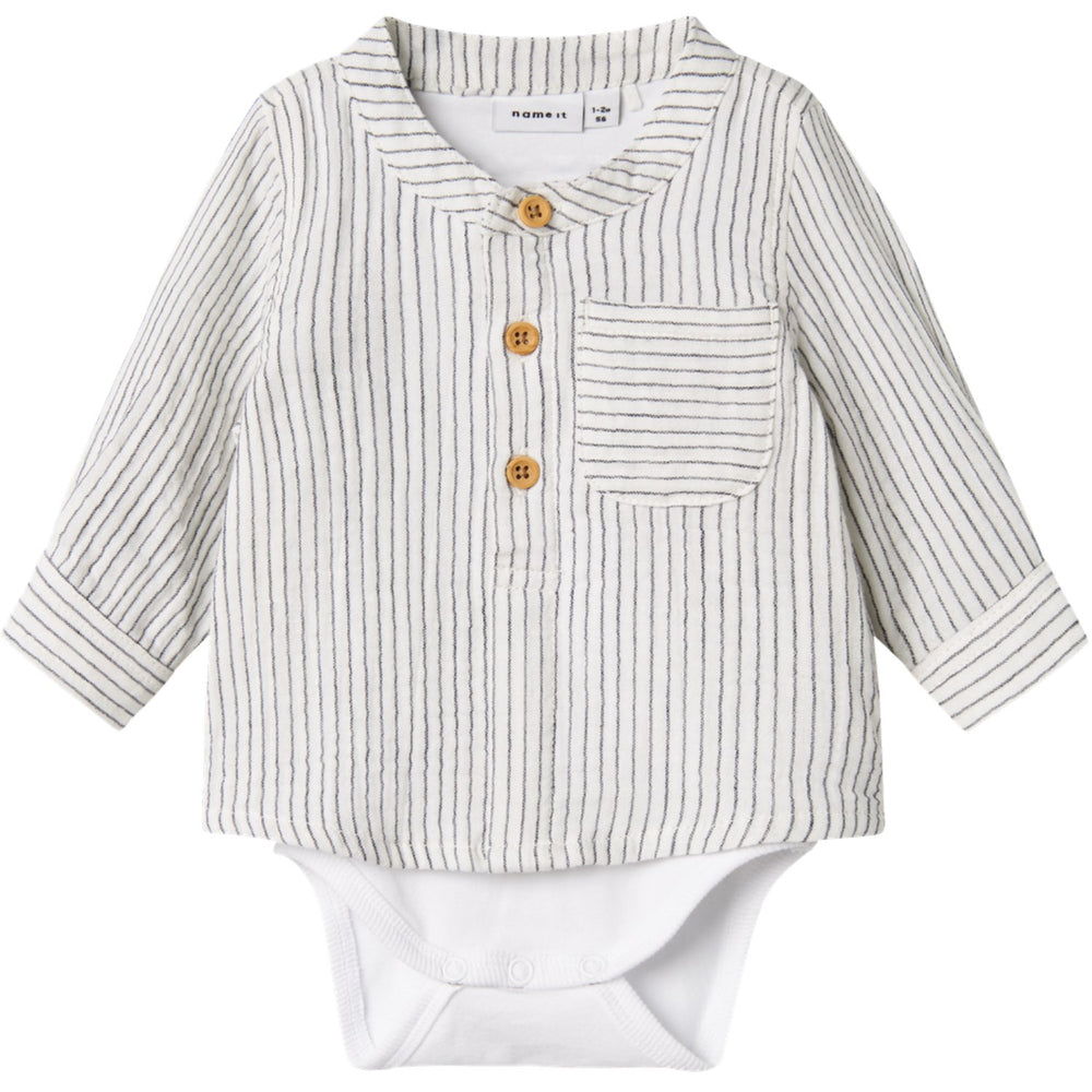 Upptäck vår Name It Navy Blazer Fedanne Skjorta Body som ger en elegant och klassisk beröring till ditt barns outfit. Denna skjorta body är tillverkad i ett vävt tyg med ett unikt korsmönster och en lätt strukturerad yta, vilket gör den utmärkt för såväl finare sammankomster som lekfulla dagar. Med långa ärmar och en skjortkrage kombinerar bodyn formalitet med bekvämlighet. Tryckknappsstängning fram gör det lätt att klä på och av. Den normala passformen ger rörelsefrihet medan trycket över hela ytan och den diskreta bröstfickan lägger till stilfulla detaljer. Sköt om den enkelt genom vanlig maskintvätt – en perfekt tillägg till varje barns garderob för både vår och sommar.