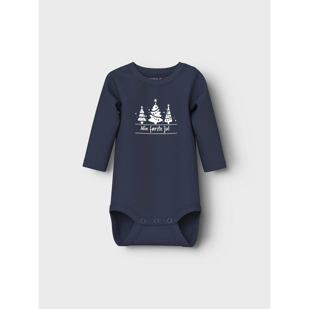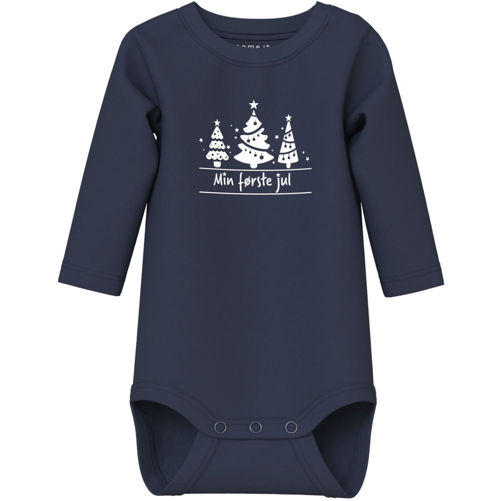Den klassiska marinfärgade basen är kompletterad med ett lekfullt julmotiv som garanterat kommer att dra ögonen till sig. Med en rund hals och långa ärmar håller den ditt barn varmt och bekvämt. Tryckknappar underlättar på- och avklädning, vilket gör denna bodysuit praktisk för såväl fest som lek.