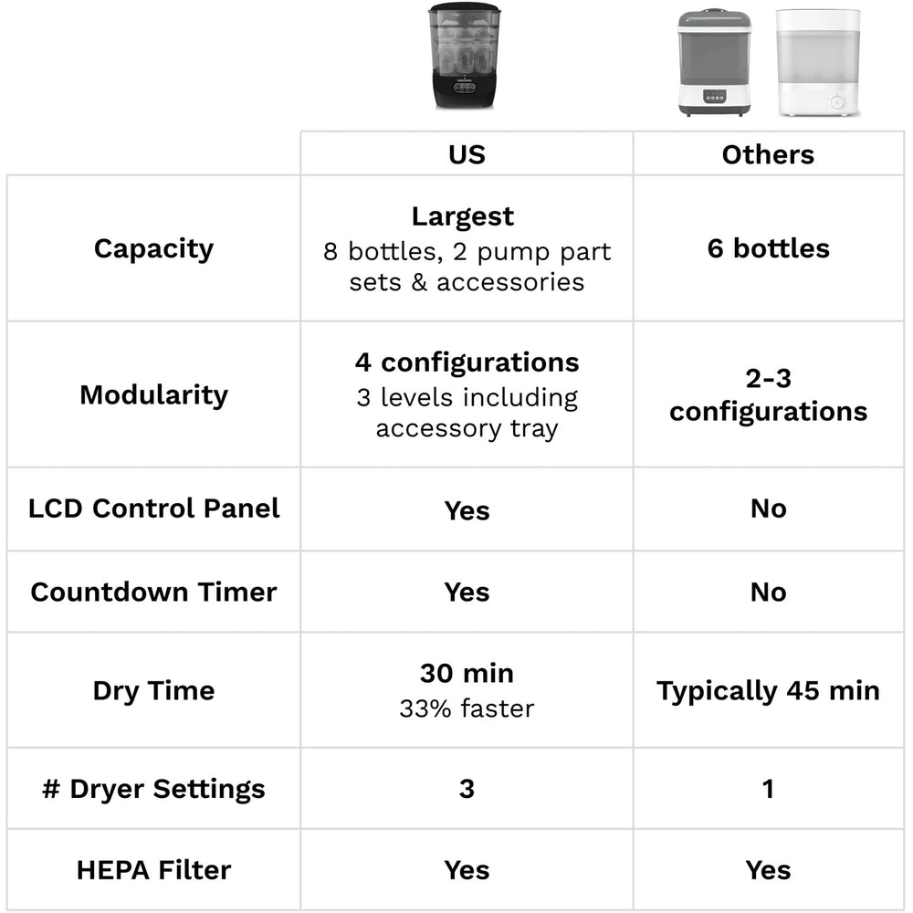 - Dödar 99,9 % av bakterierna med naturlig ångvärme och torkar sedan alla delar 33 % snabbare