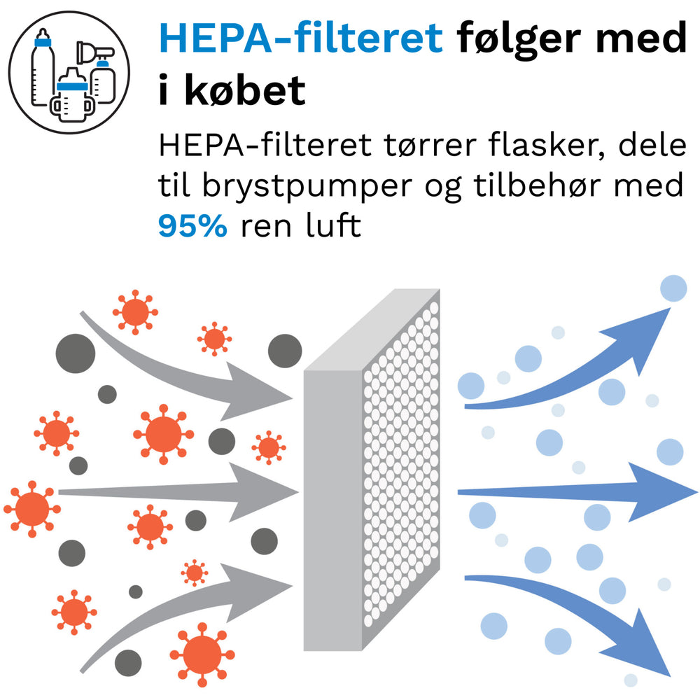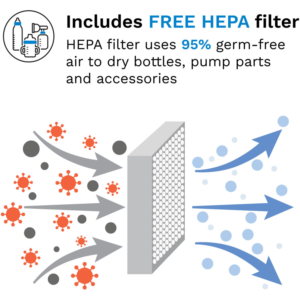 - Inkluderar ett utbytbart HEPA-filter så att det torkar alla delar med 95 % bakteriefri luft.