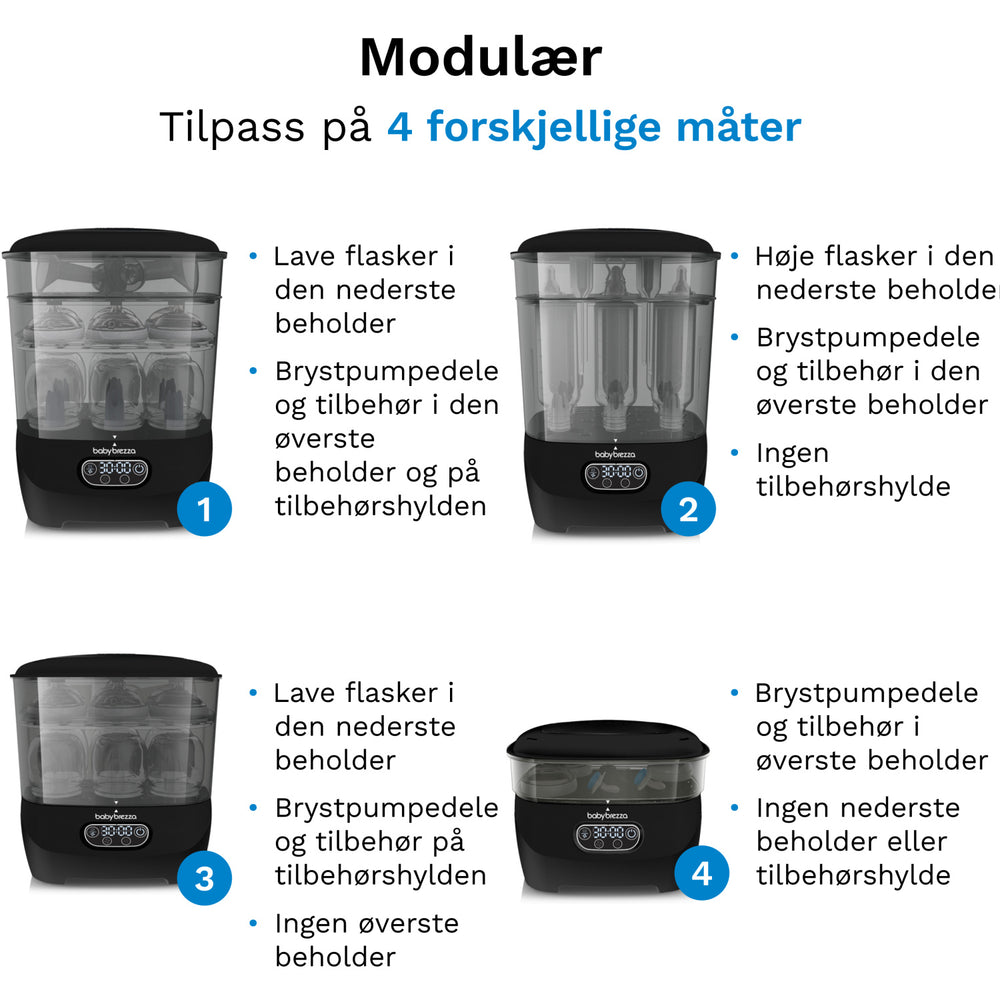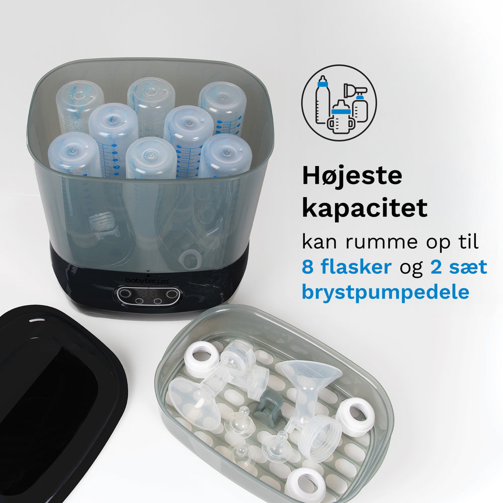 - Steriliserar och torkar automatiskt flaskor, tillbehör och bröstpumpsdelar