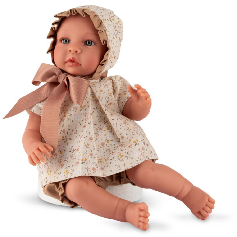Leonora har en mjuk kropp som gör henne lätt att krama och bära medan armar, ben och huvud i fast form bidrar till hennes hållbarhet. Denna kombination säkerställer en lätt användning och hantering även för de yngste. Hon är klädd i en charmig blommig klänning med matchande hätta som har en spetskant, komplett med stora rosetter, vilket gör henne till en stilfull tillägg i varje lekrum.
