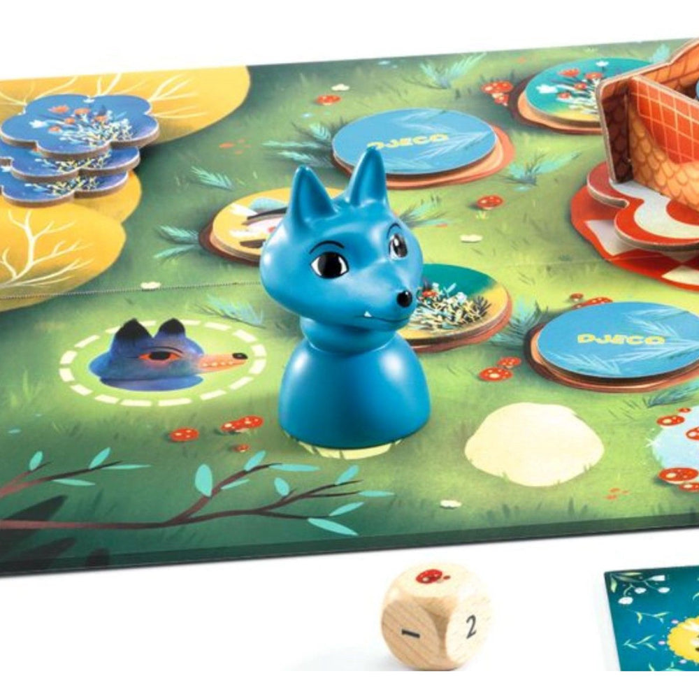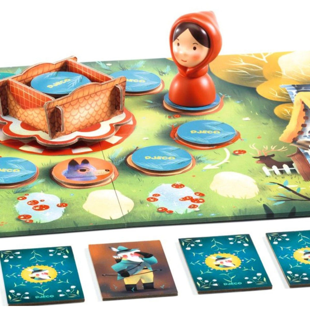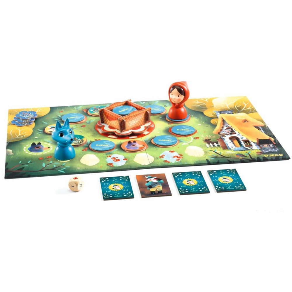 • Extra: Består av: 1 spelbräde + 2 figurer (Rödluvan och vargen) + 1 kub + 1 korg + 11 runda brickor + 5 blomformade brickor + 4 rektangulära brickor + 1 uppsättning spelregler.