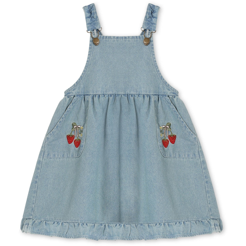 Upptäck vår charmiga Fliink Light Denim Blue Don Embr Spencerdress – en denimklänning som förenar klassiskt hantverk med lekfulla detaljer. Denna spencerklänning är tillverkad av 100% bomull, vilket gör den både bekväm och hållbar för barnens aktiva dagar. Designen har en klassisk spännestängning och är prydd med fina broderade sommarjordgubbar på sidofickorna, vilket tillför en unik touch.