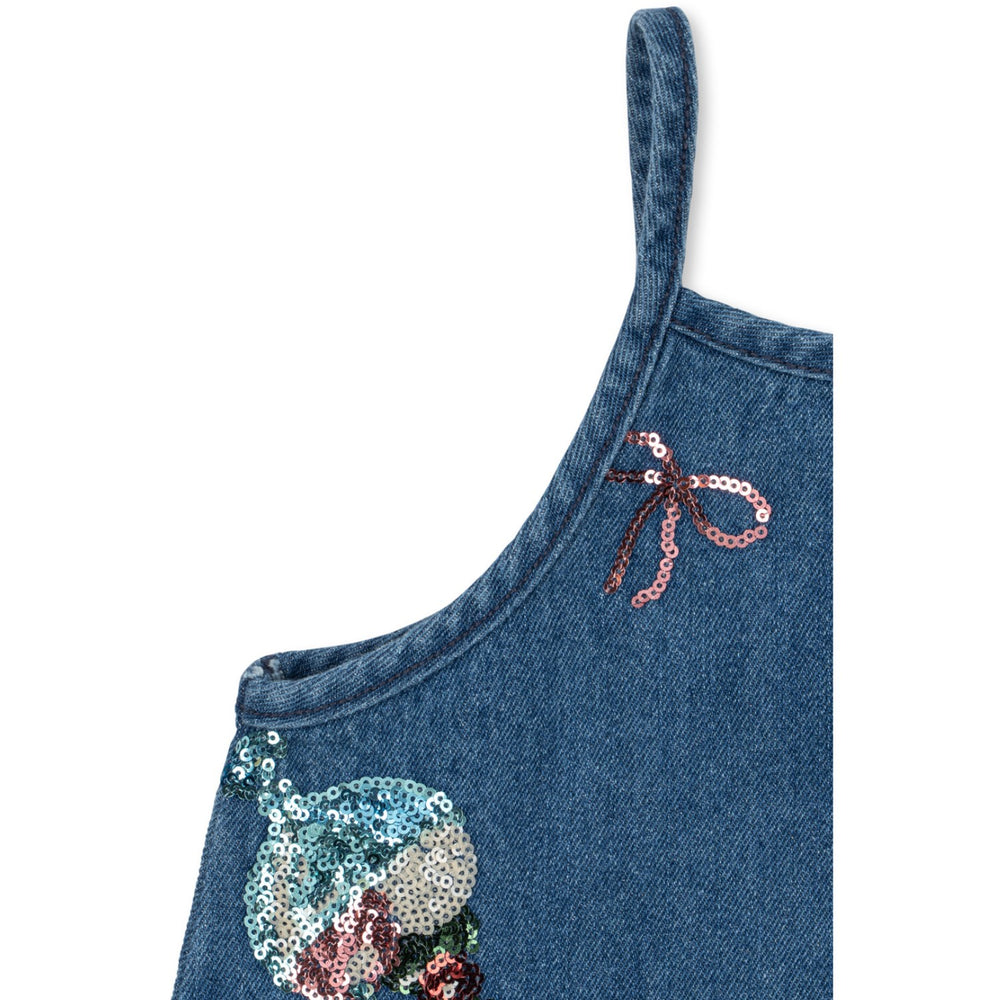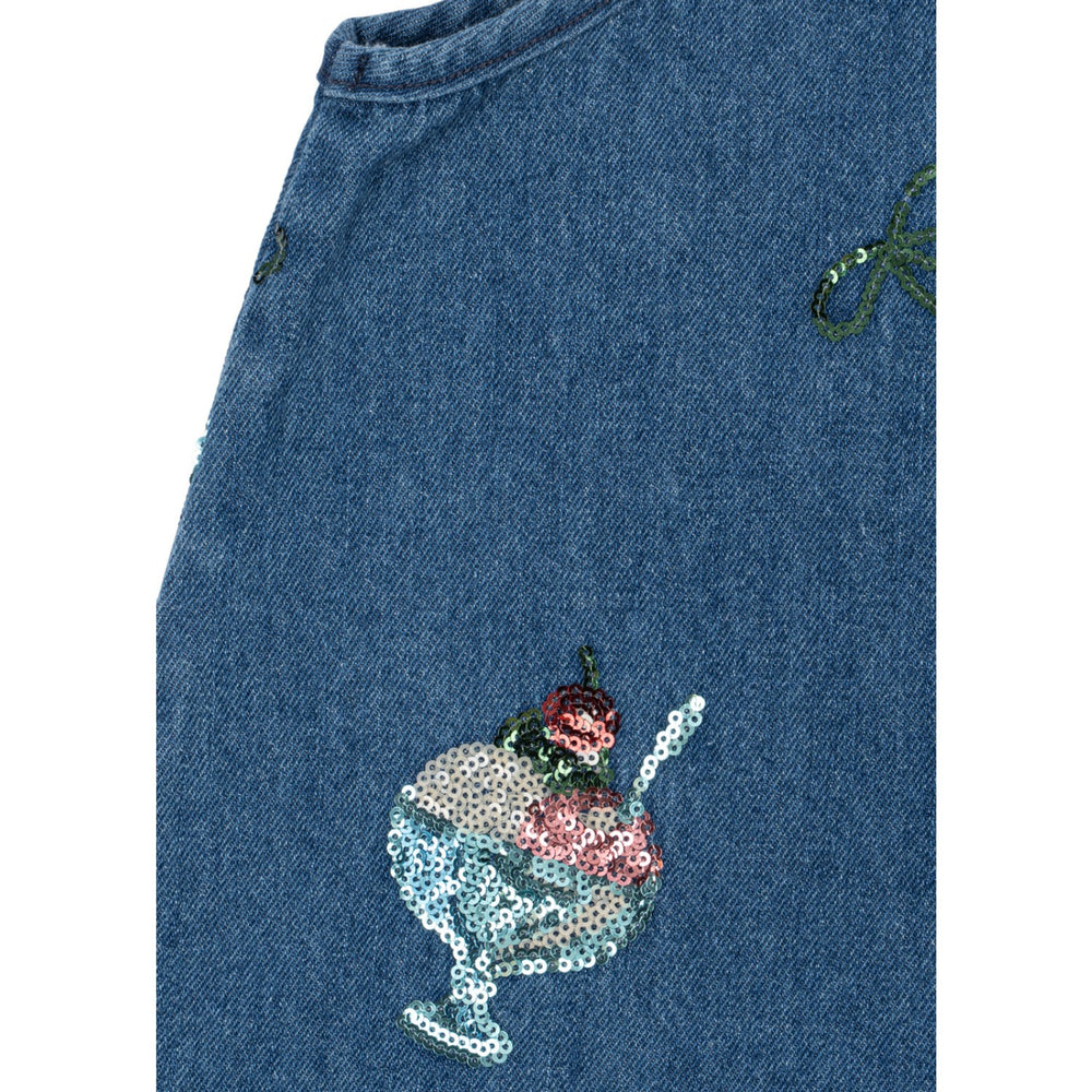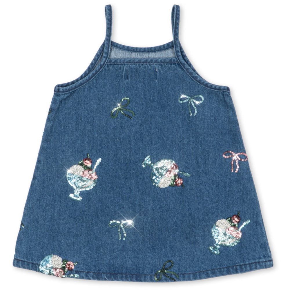Upplev den charmiga Konges Sløjd Gelato Magot Paljet Rem Klänning Gots, perfekt för ditt barns garderob. Denna unika denimklänning, prydd med broderade paljettglassar, erbjuder en rak, smickrande siluett som kan bäras både ensam och i kombination med en t-shirt eller blus under för extra stil. Dess hållbara material och bekväma passform gör den idealisk för lekfulla dagar. Det lättskötta tyget säkerställer att klänningen håller sig fin tvätt efter tvätt.