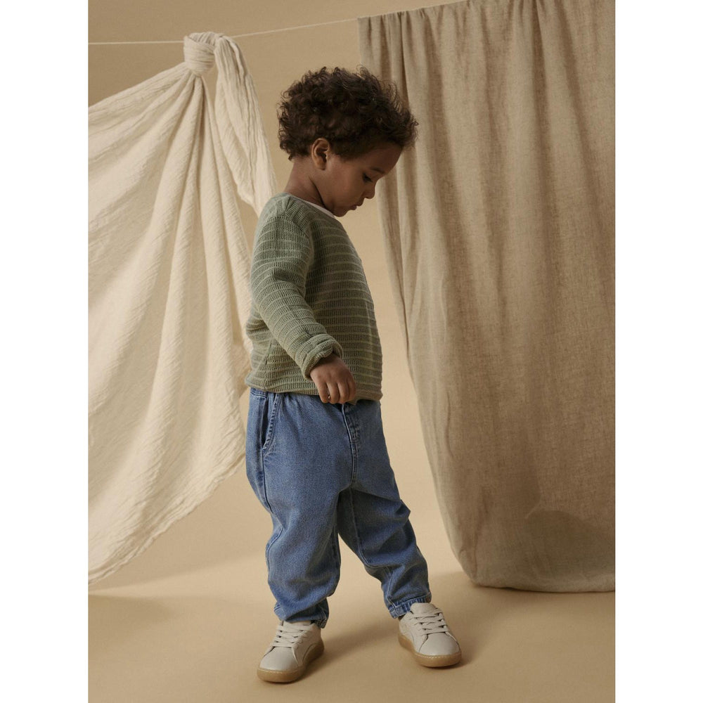 Byxorna har en lös passform och är utrustade med praktiska detaljer som justerbar midja för optimal passform och komfort. Fickorna fram och bak tillför både stil och användbarhet, perfekt för att förvara små skatter. Lil'Atelier jeansen är lätta att ta på och av tack vare tryckknappar och en halv mock gylf fästning. Ett idealt val för lekfulla dagar och avslappnade eftermiddagar. Sköt om dessa värdefulla plagg genom mild tvätt för långvarig användning. Idealiska för allt från vardagsäventyr till familjesammankomster, dessa jeans levererar både stil och komfort för ditt barn. Stängning: Tryck Stud och Half Mock Fly Passform: Påsig Material: 100% Bomull - Ekologisk Tvättråd: Maximal tvättemperatur 40°C - Normal process Extra: Huvudmaterialet i denna produkt innehåller minst 50 % ekologisk bomull.