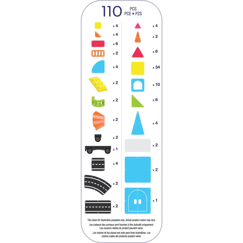 • 110 magnetiska delar – inklusive vägsektioner, spiral- och klassiska trappor, balkonger, staket, microMAGS och ett bilchassi med hjul och axlar för att ge staden liv.