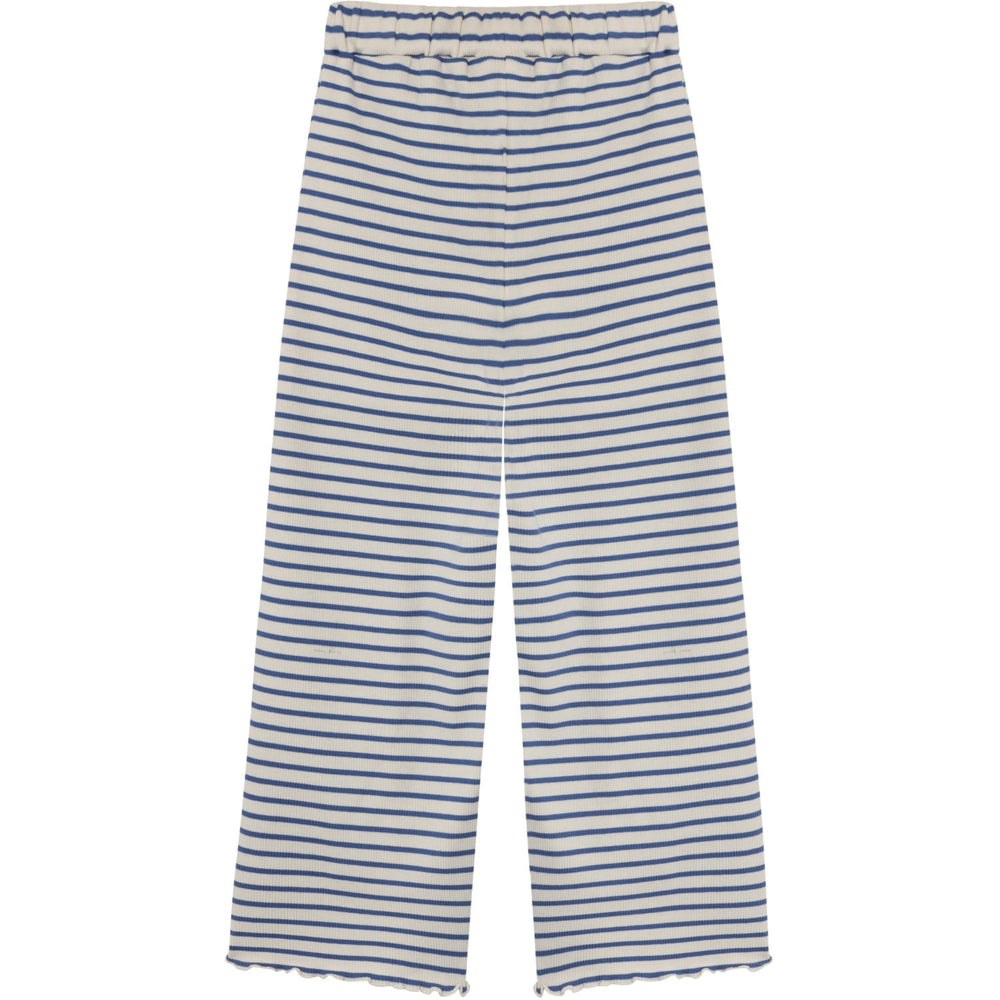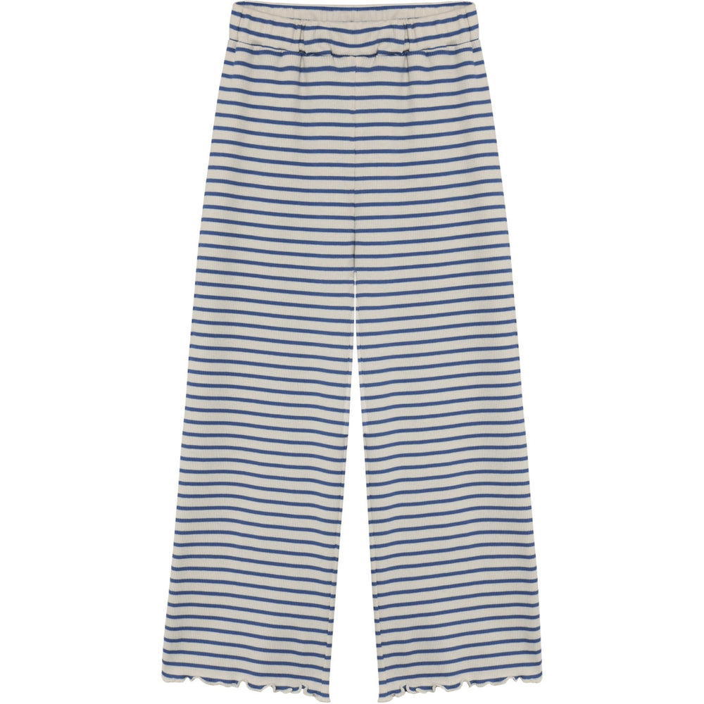 Upptäck de charmiga Minymo Dutch Blue Byxor Rib för ditt barn! Dessa bekväma byxor är tillverkade av ekologiskt GOTS-certifierat randigt material, vilket garanterar både hållbarhet och miljövänlighet (CERES-0366). Med sin elastiska midja och vågiga fållar i benavsluten erbjuder de utmärkt passform och rörelsefrihet. Det blå och vita randiga mönstret tillför stil och gör dem till ett perfekt val för både lek och avslappnade dagar.