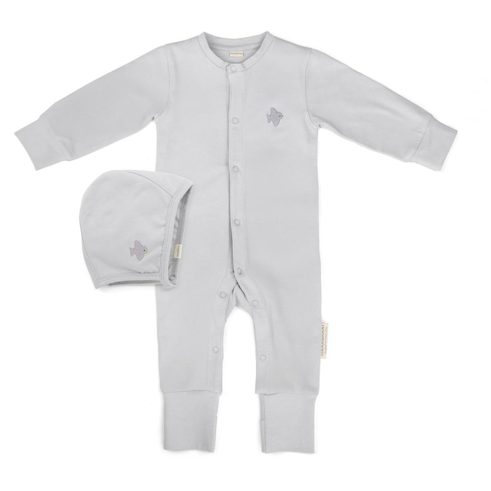 Med sitt stretchiga, organiska tyg och praktiska tryckknappar erbjuder dessa plagg inte bara en skön passform men också enkelhet i på- och avklädning, vilket är perfekt för de livliga första månaderna. Varje detalj är noggrant utformad med barnets behov i åtanke – från de vikbara tumkanterna som håller händerna varma till den matchande babyhjälmen som skyddar små huvuden.