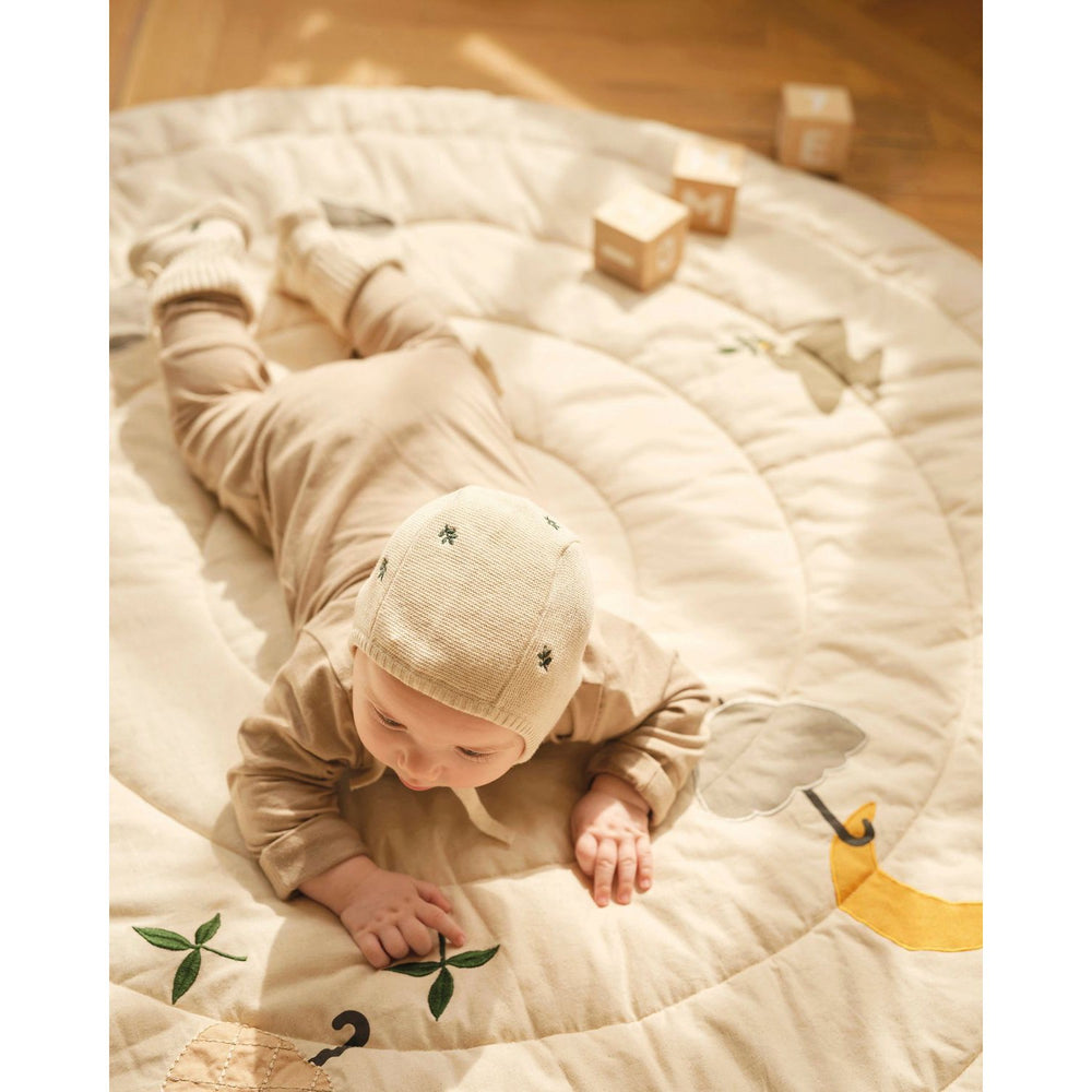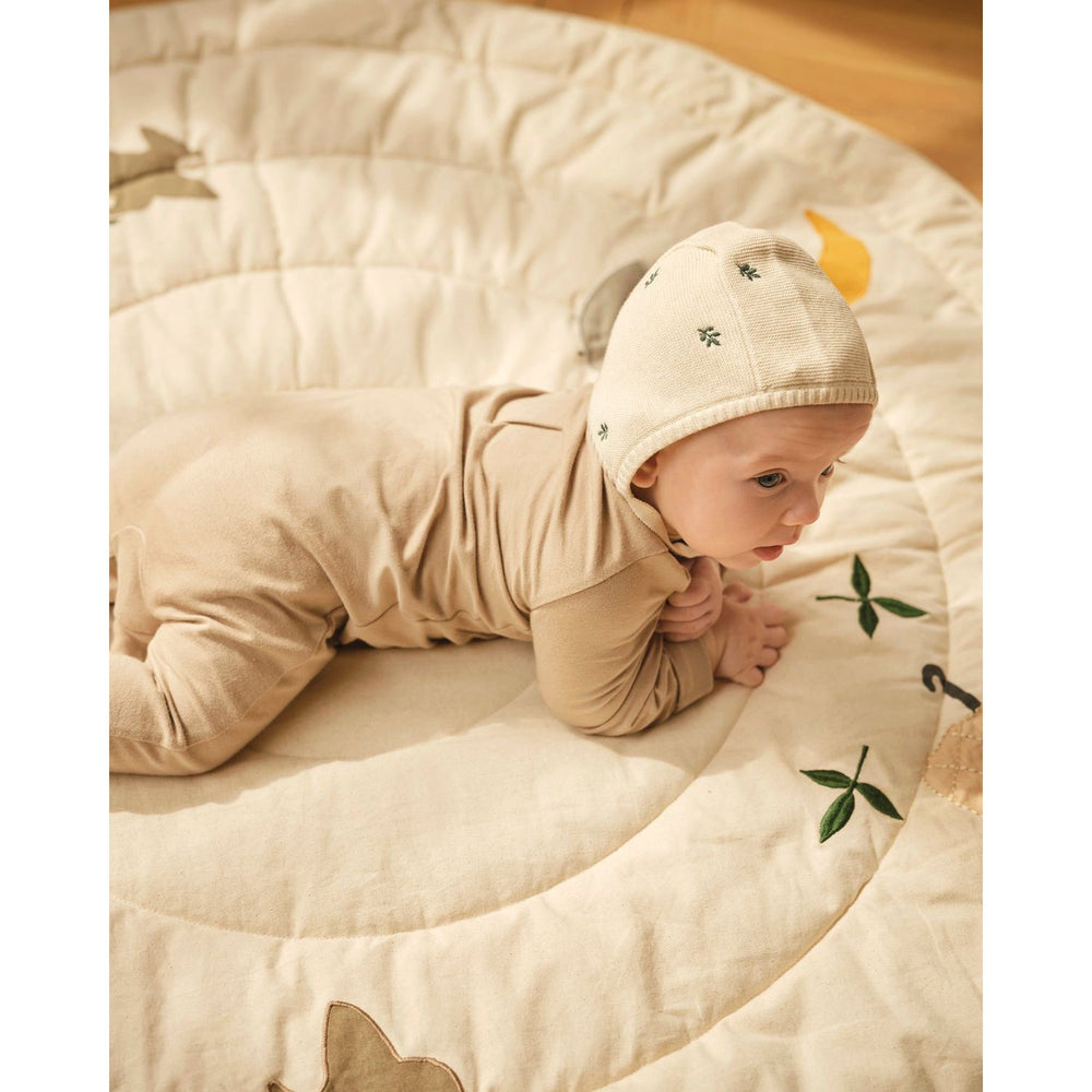 Specifikationerna inkluderar en generös storlek på 120 cm, vilket ger gott om utrymme för ditt barn att utforska. Dessutom är materialet både hållbart och mjukt för maximal komfort och ergonomi. Den könsneutrala färgsättningen och de snygga broderierna gör att den passar in i varje barn- och vardagsrum, vilket adderar en stilren och lugnande estetik till hemmet.