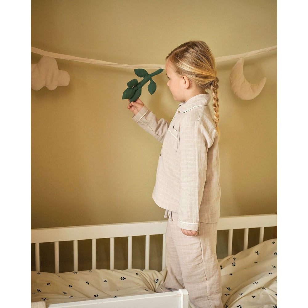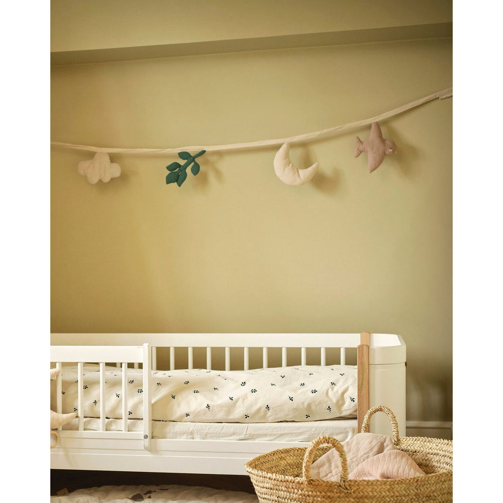 Förvandla barnrummet till en fantasifull och trygg miljö med Moonboon Nature Stofguirlande. Denna eleganta girlang är tillverkad av mjuka, naturliga och ekologiska material, vilket garanterar säkerhet och komfort för ditt barn. Hängande figurer inspirerade av H.C. Andersens "Ole Lukøje" stimulerar barnets fantasi och skänker en lugn atmosfär. Passar perfekt på väggar, spjälsängar eller hyllor och är enkel att placera i rummets önskade del.