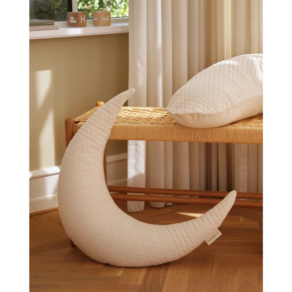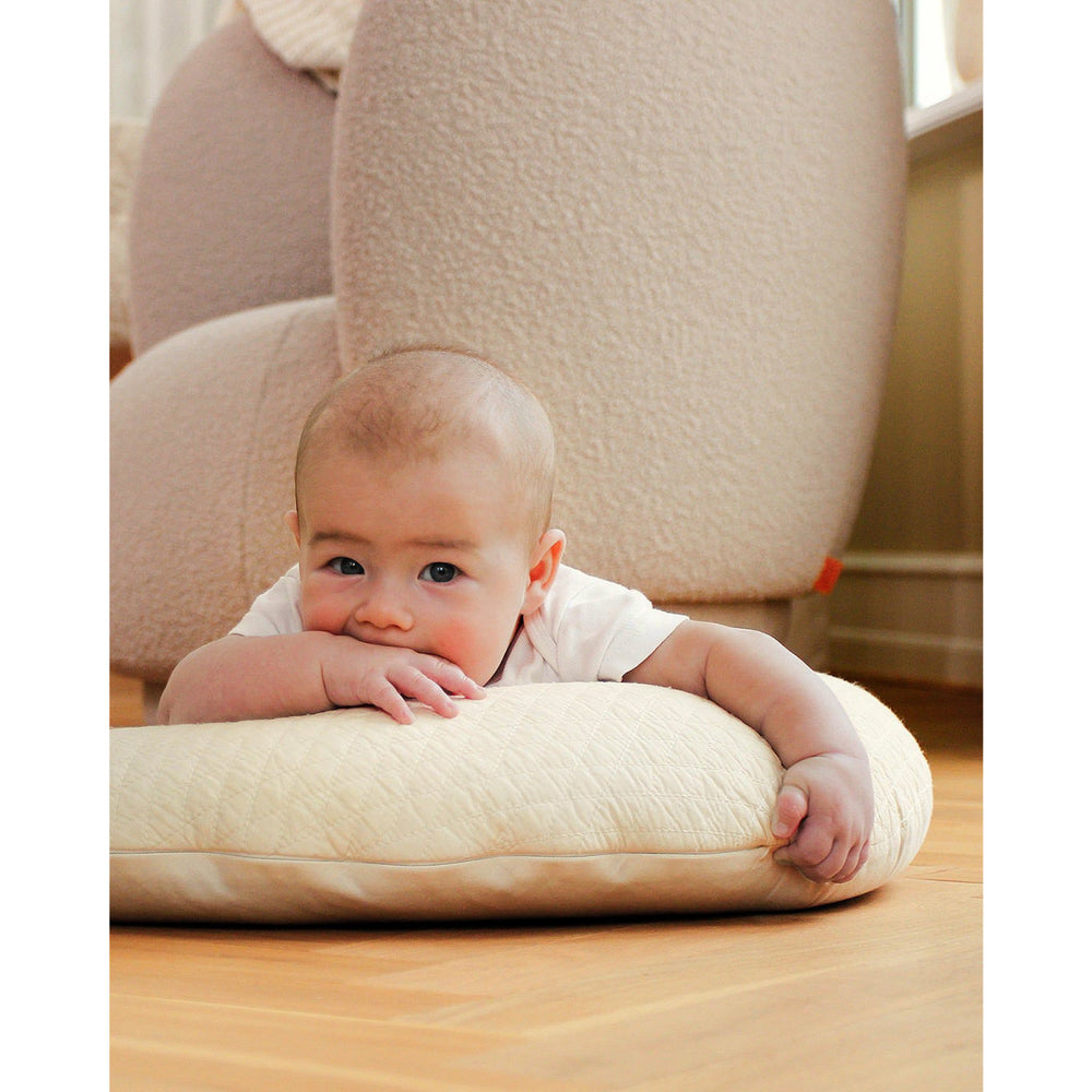 Denna ergonomiskt utformade kudde inte bara ser fantastisk ut men är också toppen för komfort och stöd tack vare dess unika form som omsluter och stöttar rätt. Varje aspekt av kudden har designats med ditt och ditt barns välbefinnande i åtanke. Dess yttre lager är tillverkat av mjuk, GOTS-certifierad bomull, medan det inre lagret är fyllt med allergivänliga och temperaturreglerande ekologiska boveteskal, perfekt för att hålla barnet bekvämt året om.