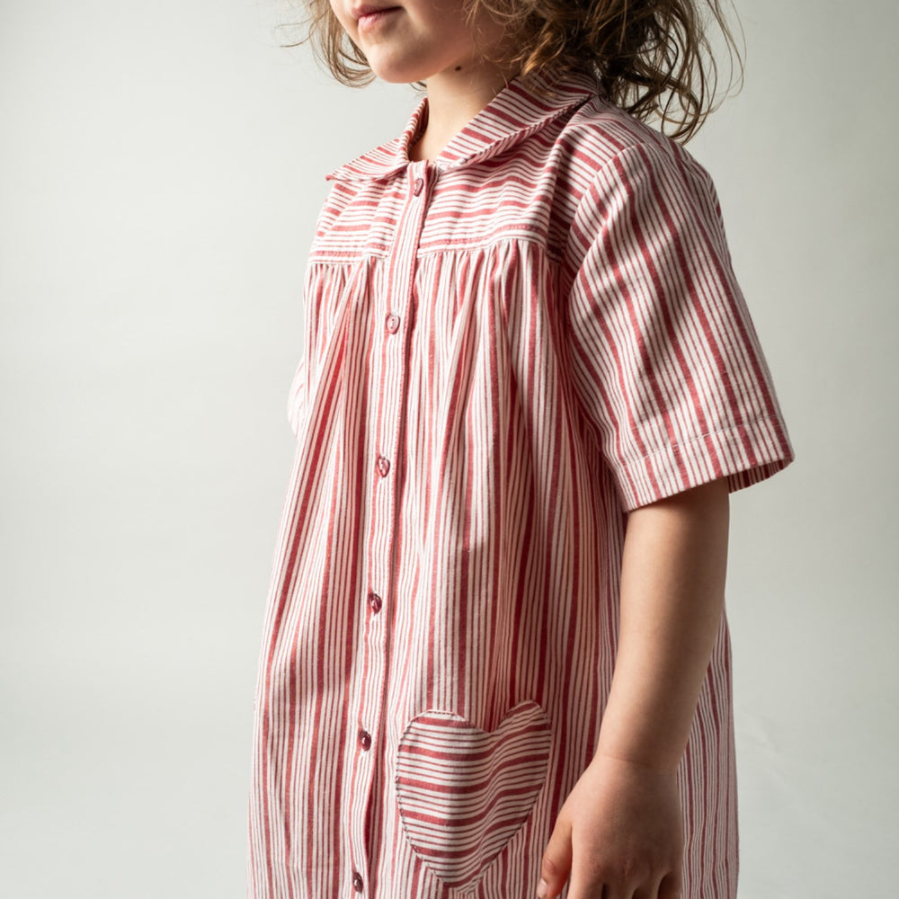 Upplev charmen med "That's Mine Classic Red Heart Klänning", som kombinerar ultimat komfort och stilfull design. Denna skjortklänning i livliga röda och vita ränder är tillverkad i mjuka material som är skonsamma mot barnets hud. Med söta hjärtformade knappar och dubbla fickor framtill erbjuder den inte bara en bedårande look utan även praktisk förvaring för små skatter. Klänningen är perfekt för alla typer av aktiviteter, från lekfulla dagar till festliga tillfällen.