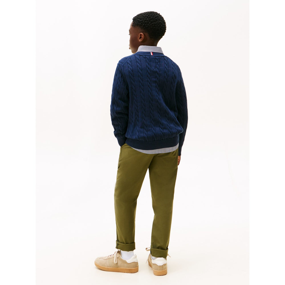 Upptäck värmen och stilen med Tommy Hilfiger Dark Night Navy Graphic Cable Cn Sweater. Denna tröja är tillverkad i skönt material med klassiskt kabelstickat mönster, perfekt för kyliga dagar. I djupt mörkblått med ett iögonfallande grafiskt mönster som framhäver dess unika design. Dess passform och bekvämlighet gör den idealisk för barns aktiva lek. Lätt att sköta och håller sig snygg tvätt efter tvätt. Material: Ekologisk bomull (100%)