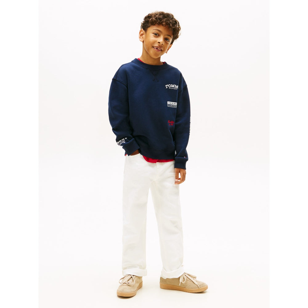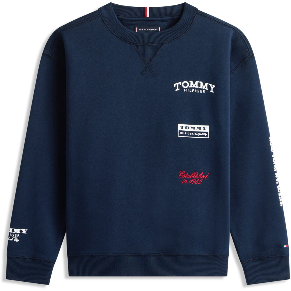 Upplev stil och komfort med Tommy Hilfiger's Dark Night Navy Multi Print Sweatshirt. Denna tröja är tillverkad av mjukt material, dekorerad med ett iögonfallande mönster och kommer i en mörk marinblå färg som passar alla barn. Med dess perfekta passform och höga slitstyrka är det ett utmärkt val för lekfulla dagar. Lättskött; maskintvättbar. Material: Regenerativ bomull (80 %), återvunnen polyester (20 %)
