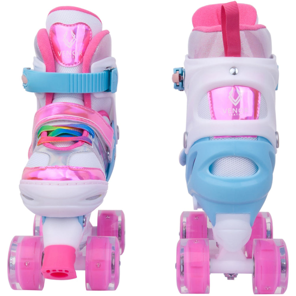 Välkomna till en färgsprakande åktur med VENOR Ignite LED-rullskridskor! Denna skräddarsydda design är glimmrande festlig och framtagen för att justeras i fyra olika storlekar, så att den kan anpassas när ditt barn växer. Du justerar storleken enkelt med en knapp, vilket gör skridskorna långlivade och en ständig följeslagare genom barnens uppväxt.